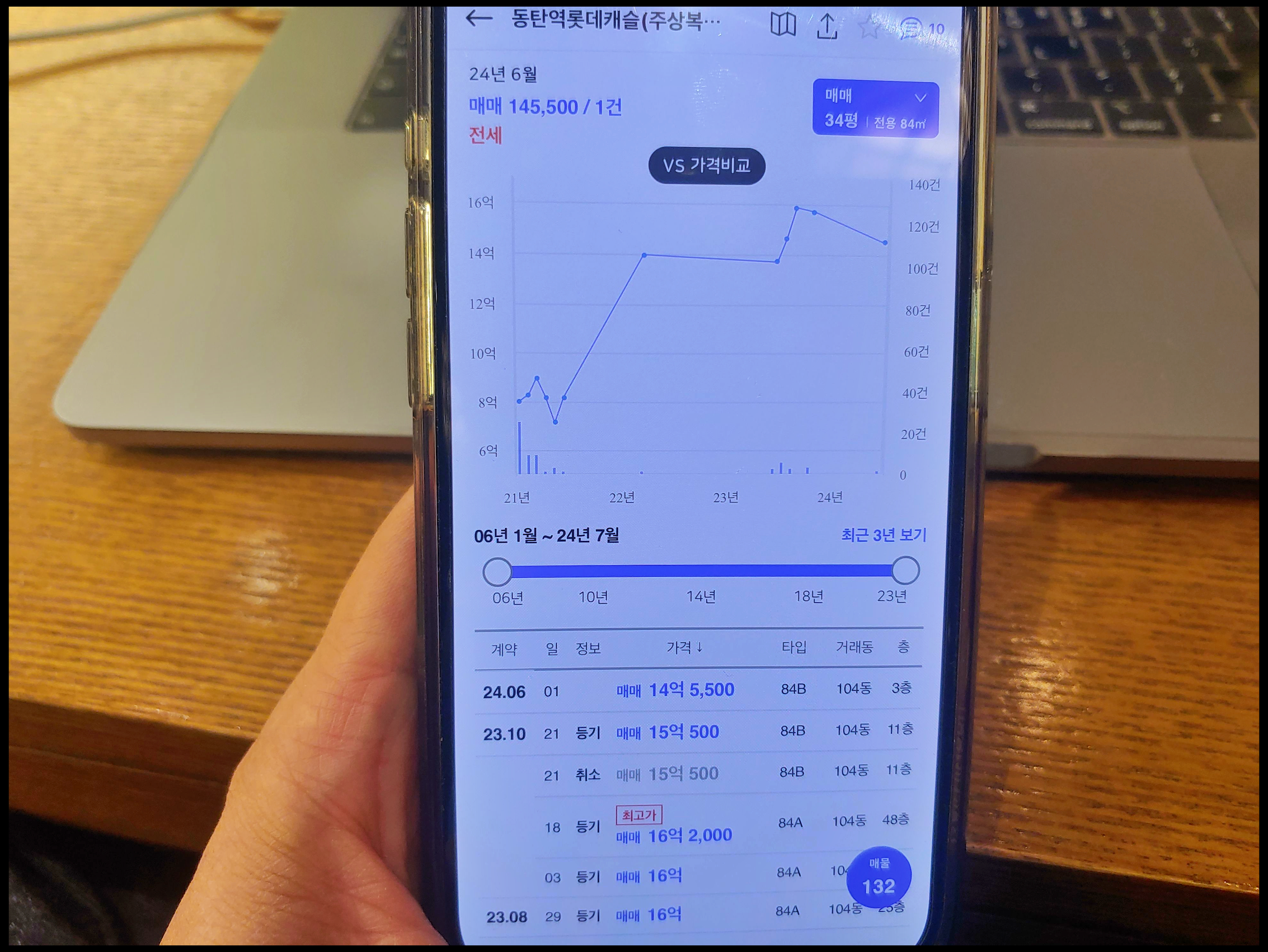 [사진 = 동탄역 롯데캐슬 84타입 지난해 10월에 16억 2,000만 원 역대 최고가 거래가 있었습니다. 가장 최근인 지난달 1일에 14억 5,500만 원 거래됐습니다. 이번 취소분 및 줍줍 분양가 4억 원대 후반입니다. 시세 차익 10억 원 예상됩니다. (C) 아실 앱]