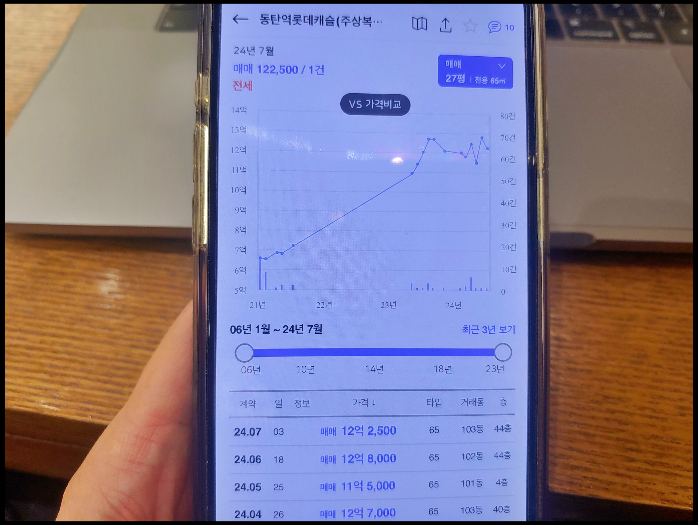 [사진 = 동탄역 롯데캐슬 65타입 지난 3개월 동안 11~12억 원대 거래가 있었습니다. 가장 최근에는 이번달 3일 12억 2,500만 원 거래됐습니다. 이번 취소분 분양가 3억 6,300만 원이라는 점에서 시세 차익 8~9억 원 예상됩니다. (C) 아실 앱]