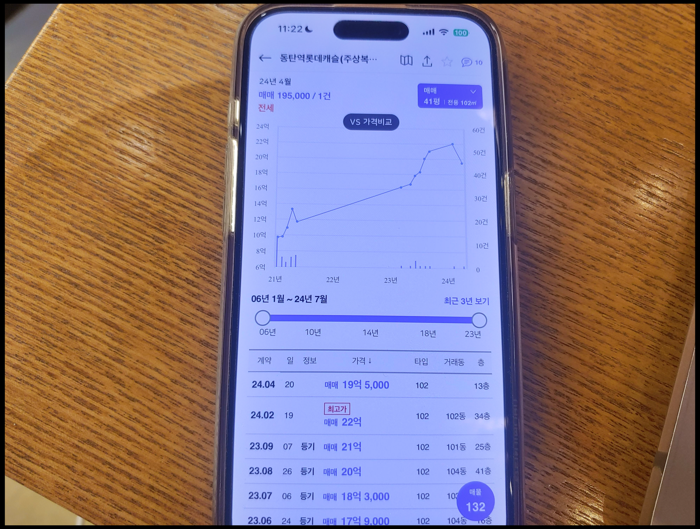 [사진 = 동탄역 롯데캐슬 102타입 가장 눈에 띄는 부분은 지난 2월 22억 원 거래입니다. 알고보니 그 이전에도 20억 원대 거래들이 있었으며, 22억 원 거래 포함하면 3연속입니다. 그러다가 지난 4월에 19억 5,000만 원 거래가 있었습니다. 이번 취소분 분양가 5억 원대 후반입니다. 시세 차익 14~17억 원 예상됩니다. (C) 아실 앱]