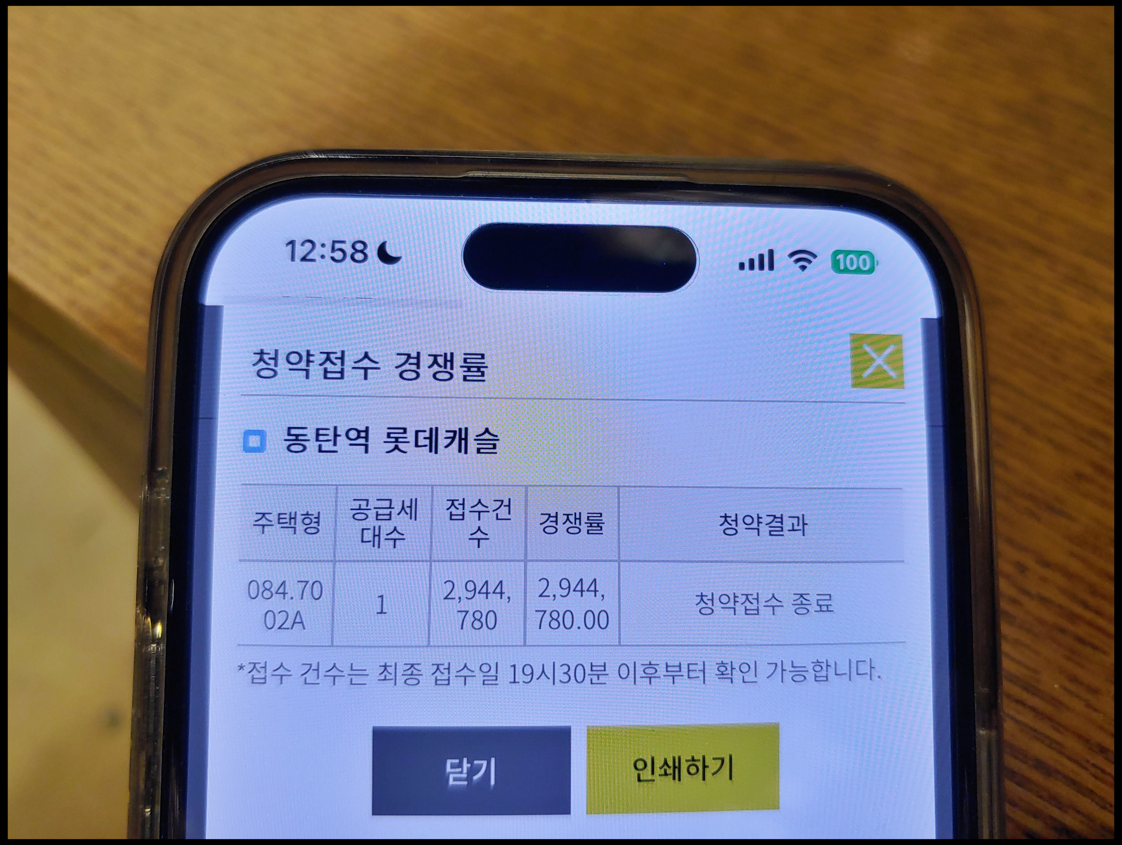 [사진 = 동탄역 롯데캐슬 무순위 경쟁률 84타입 1세대 모집 2,944,780대 1 나왔습니다. 294만 명이 신청하는 엄청난 대기록 수립됐습니다. (C) 청약홈 앱]