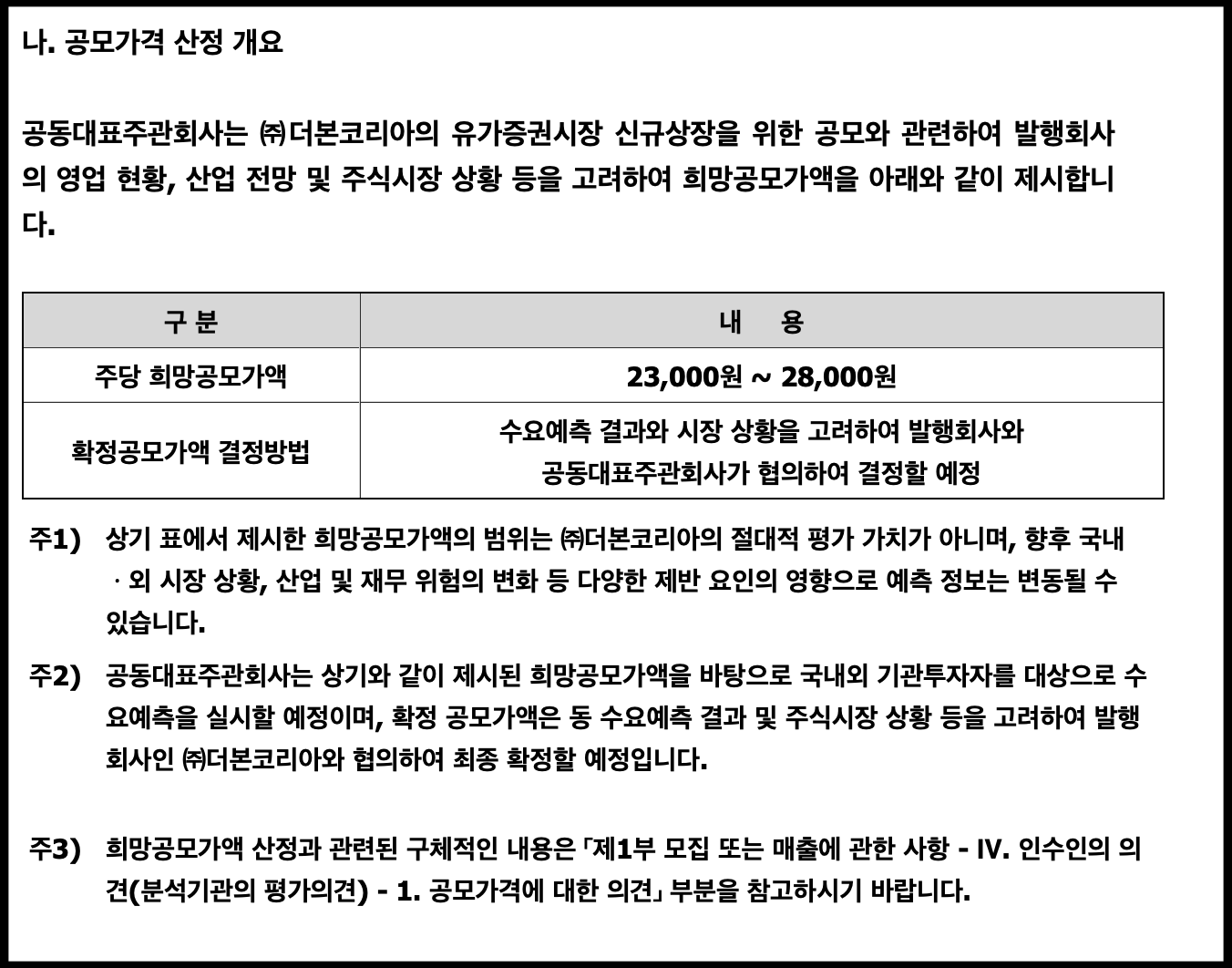 [사진 = 더본코리아 공모주 희망 공모가 밴드 23,000원 ~ 28,000원입니다. 만약 수요예측 결과 좋으면 최종 금액이 어떻게 결정될지 주목됩니다. 근래에는 수요예측 좋게 나오는 종목들 다수가 최종 공모가 금액을 밴드 상단보다 올리는 경우가 많았습니다. (C) DART 공식 홈페이지]