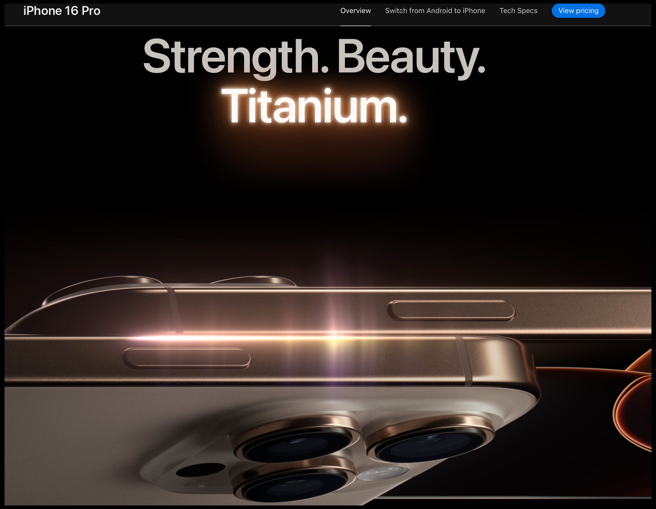 [사진 = 아이폰16 16프로 차이 후면 재질 다릅니다. 일반 모델 중에서 화이트 제외한 다른 색상 4가지는 알루미늄 및 컬러 인퓨즈 글래스 소재로 제작됐습니다. 프로 모델은 5등급 티타늄 디자인을 선택했습니다. 가벼우면서 견고한 생김새를 나타냅니다. 애플이 프로 모델의 매리트를 높였다고 볼 수 있습니다. (C) 애플 공식 홈페이지(apple.com)]