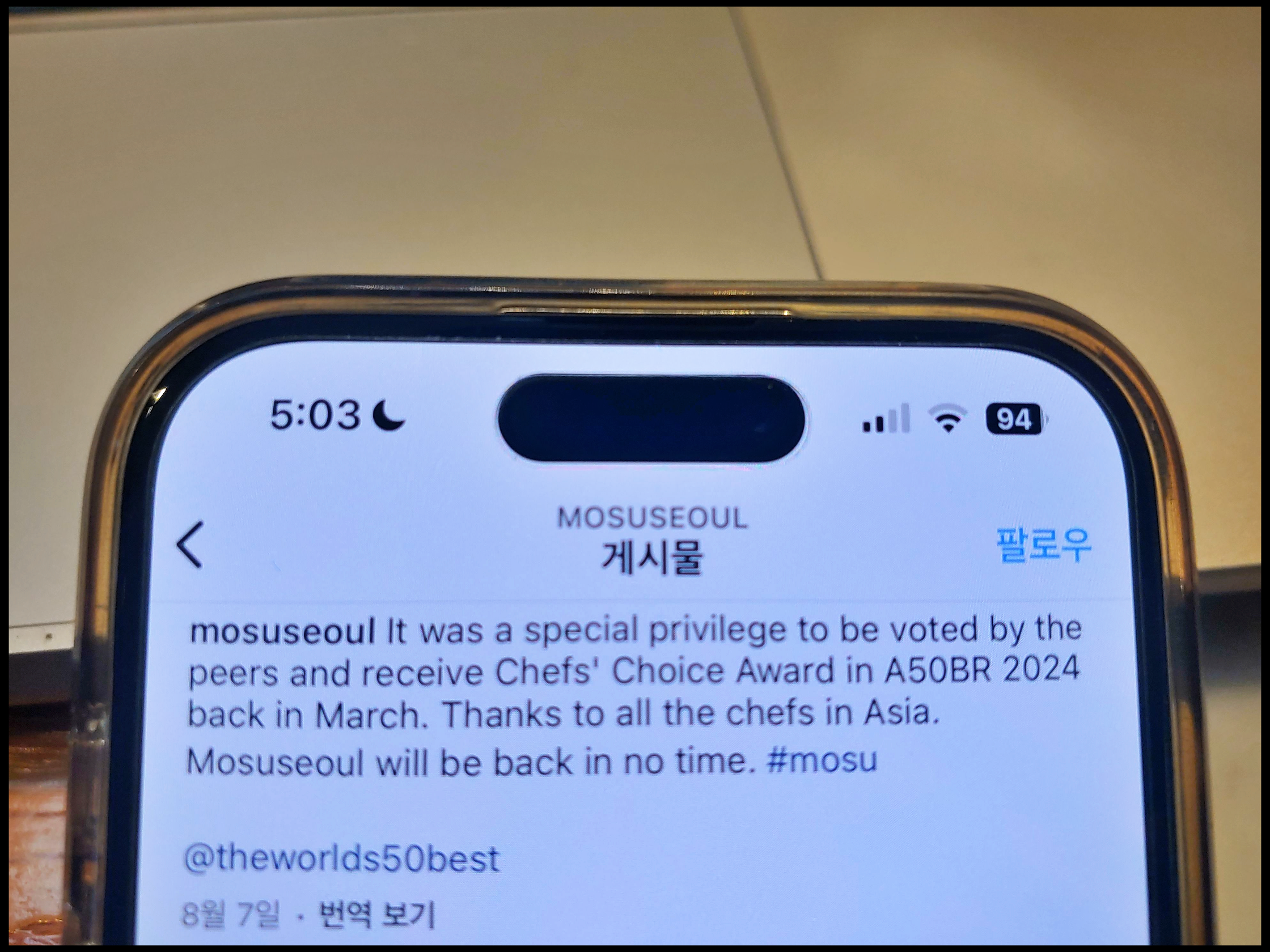 [사진 = 모수 서울 인스타그램 메인에서는 이곳이 매장 이전 관계로 예약 받지 않는다고 합니다. 가장 최근에 올라왔던 8월 7일 게시물에서도 "모수 서울은 곧 돌아올 것입니다"라는 문구가 영어로 표기됐습니다. 넷플릭스 흑백요리사 안성재 셰프 심사위원 출연으로 화제가 된 곳이라 이곳에서 음식 먹고 싶어하는 분이 많을 것 같습니다. (C) 모수 서울 인스타그램]
