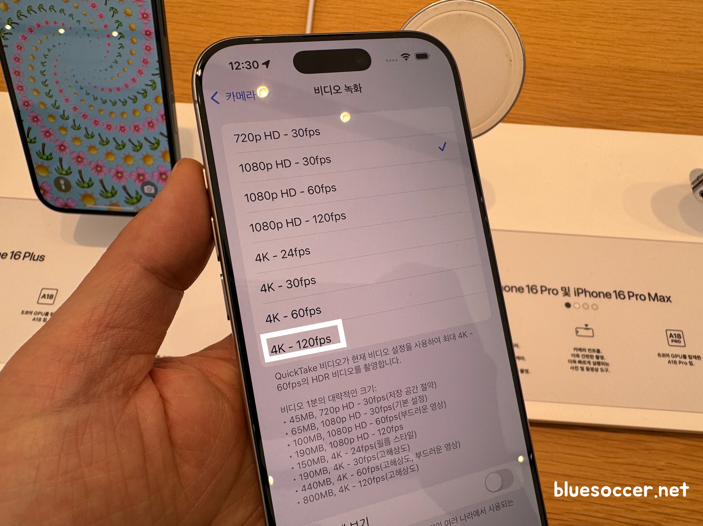 테두리가 후면과 비슷한 느낌으로 표현됐습니다. 후면 카메라 비디오 녹화를 보니 4K 120fps 새롭게 도입되었음을 알 수 있습니다. 이 부분이 유튜버 및 인스타 릴스 등을 올리시는 크리에이터 분들에게 반갑게 느껴지실 겁니다.