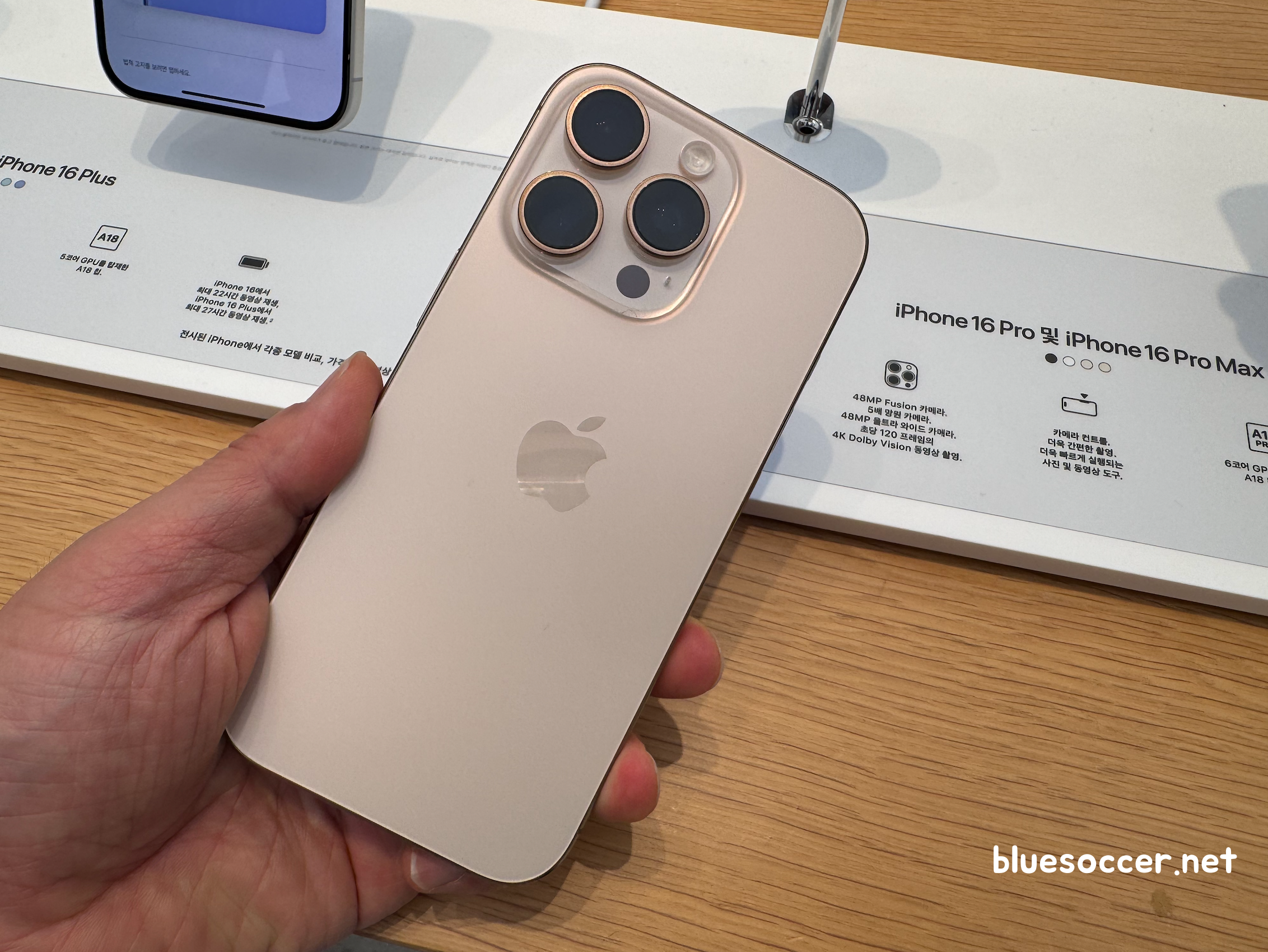 아이폰16프로 데저트티타늄 실물 모습입니다. 실제로 봤을 때에는 인터넷 이미지로 봤을 때에 비해 연합니다. 2년 전에 나왔던 아이폰14프로 골드보다 더 연하게 표현됐습니다. 은근히 로즈골드 느낌이 나기도 합니다. 실제로 이 제품 출시되기 전에 로즈골드 색상 도입 루머가 눈길을 끌었던 적이 있긴 합니다. 직접 봤을때의 모습은 아이폰6s 로즈골드와 달리 핑크색 톤이 꽤 빠졌습니다. 오히려 핑크색 톤이 진하게 표현된 제품은 같은 날 출시된 아이폰16 핑크 입니다. 실물을 보니 많이 진했습니다. 그 색상이 호불호 많이 갈릴 것 같으며, 이 글에서 만나볼 수 있는 데저트티타늄은 괜찮다고 생각합니다.