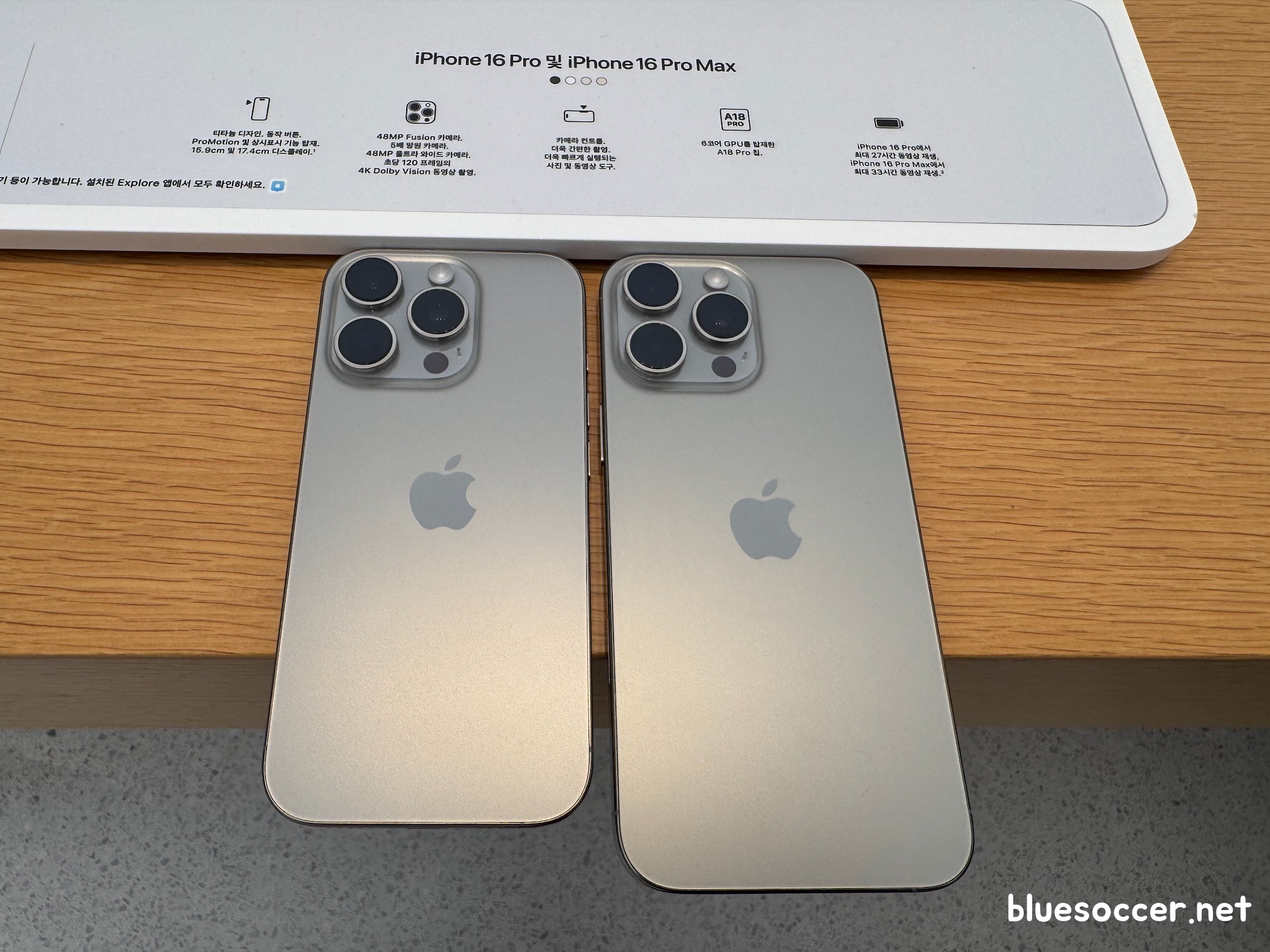 아이폰16프로 프로맥스 크기 차이 직접 살펴봤습니다. 같은 데저트티타늄 색상이나 규격이 서로 다릅니다. 손이 크신 분이라면 오른쪽에 있는 프로맥스가 더 나을 수 있습니다. 그 대신에 무거운 무게를 감수해야 합니다. 반면 손이 크지 않으신 분이라면 프로맥스가 버거울 수도 있습니다. 그런 점에서 한국에서는 프로 모델 인기가 가장 높을 것입니다. 색상 4종 중에 과연 어떤 것이 나을지 궁금하신 분들이 있겠지만, 자신이 가장 마음에 가는 색상이 가장 좋을 것 같습니다. 4종 모두 잘 나왔습니다. 일반형으로 나온 몇몇 모델에 비해 호불호 적은 편입니다. 프로 모델 색상 4종은 어떤 색을 고르든 실패 없다고 봅니다.