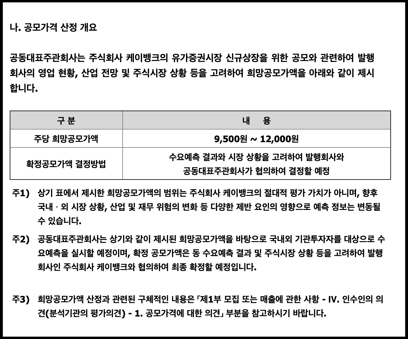[사진 = 케이뱅크 공모주 희망 공모가 밴드 9,500원 ~ 12,000원입니다. 수요예측 결과가 좋게 나올 경우 최종 공모가 금액 상향 여부가 궁금합니다. 최근에 수요예측 잘 나왔던 여러 종목들이 최종 공모가를 희망 공모가 밴드 상단보다 더 올려서 결정하는 경우가 많습니다. (C) DART 공식 홈페이지]