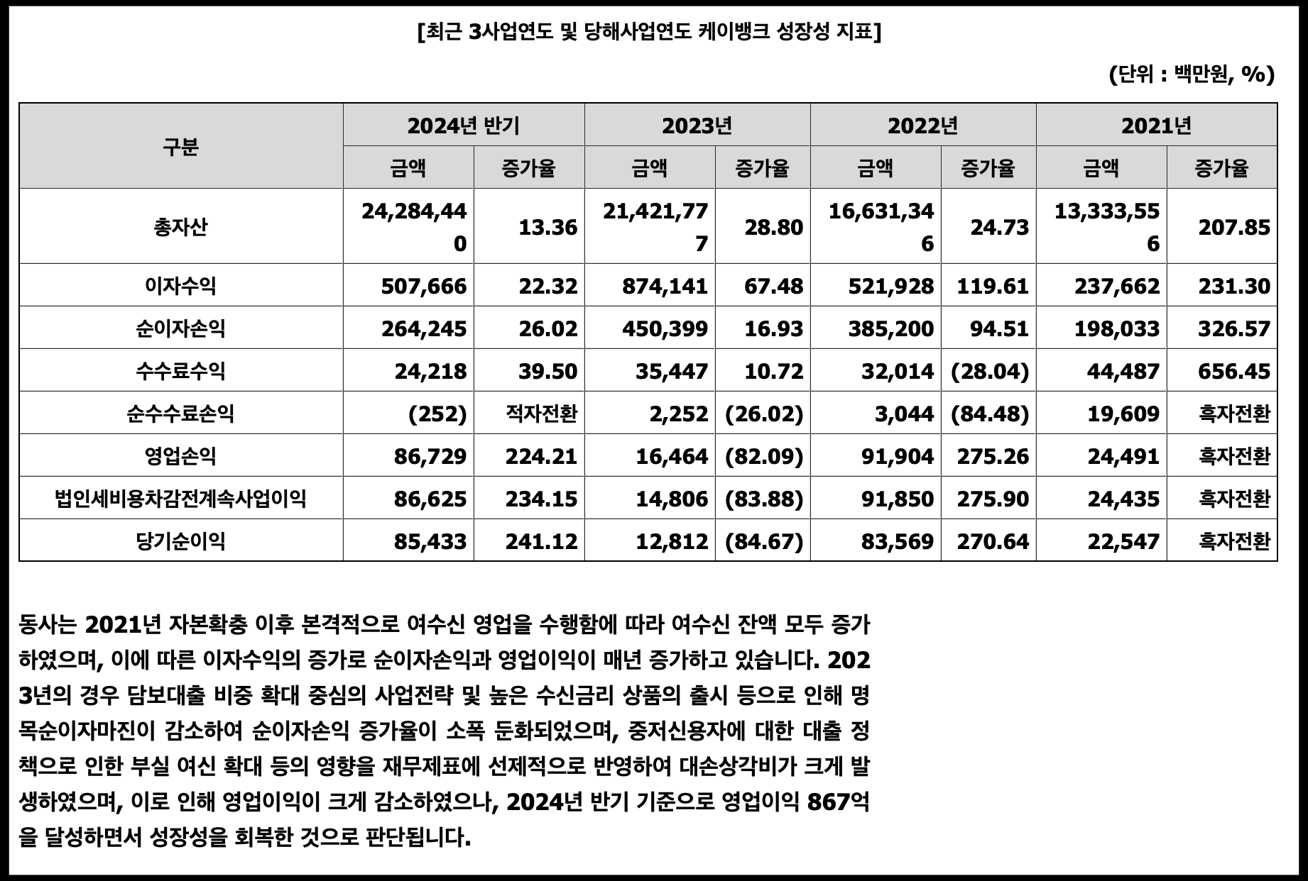 [사진 = 케이뱅크 공모주 2024년 반기 총자산 24조 2,844조 원입니다. 2021년부터 현재까지 매년마다 총자산이 나날이 높아졌습니다. 영업이익 2021년부터 살펴보면 245억 원(2021년) 919억 원(2022년) 165억 원(2023년) 867억 원(2024년 반기) 입니다. 당기순이익 2021년부터 살펴보면 225억 원(2021년) 836억 원(2022년) 128억 원(2023년) 854억 원(2024년 반기) 입니다. 2023년에 영업이익 및 당기순이익이 큰 폭으로 떨어졌으나 2024년 반기에 회복했습니다. 전반적인 흐름을 봤을 때, 영업이익이 가상화폐와 연관된 것이 아닌가 추정됩니다. 케이뱅크에서 업비트 연결계좌 고객이 거의 절반으로 알려졌습니다. (C) DART 공식 홈페이지]