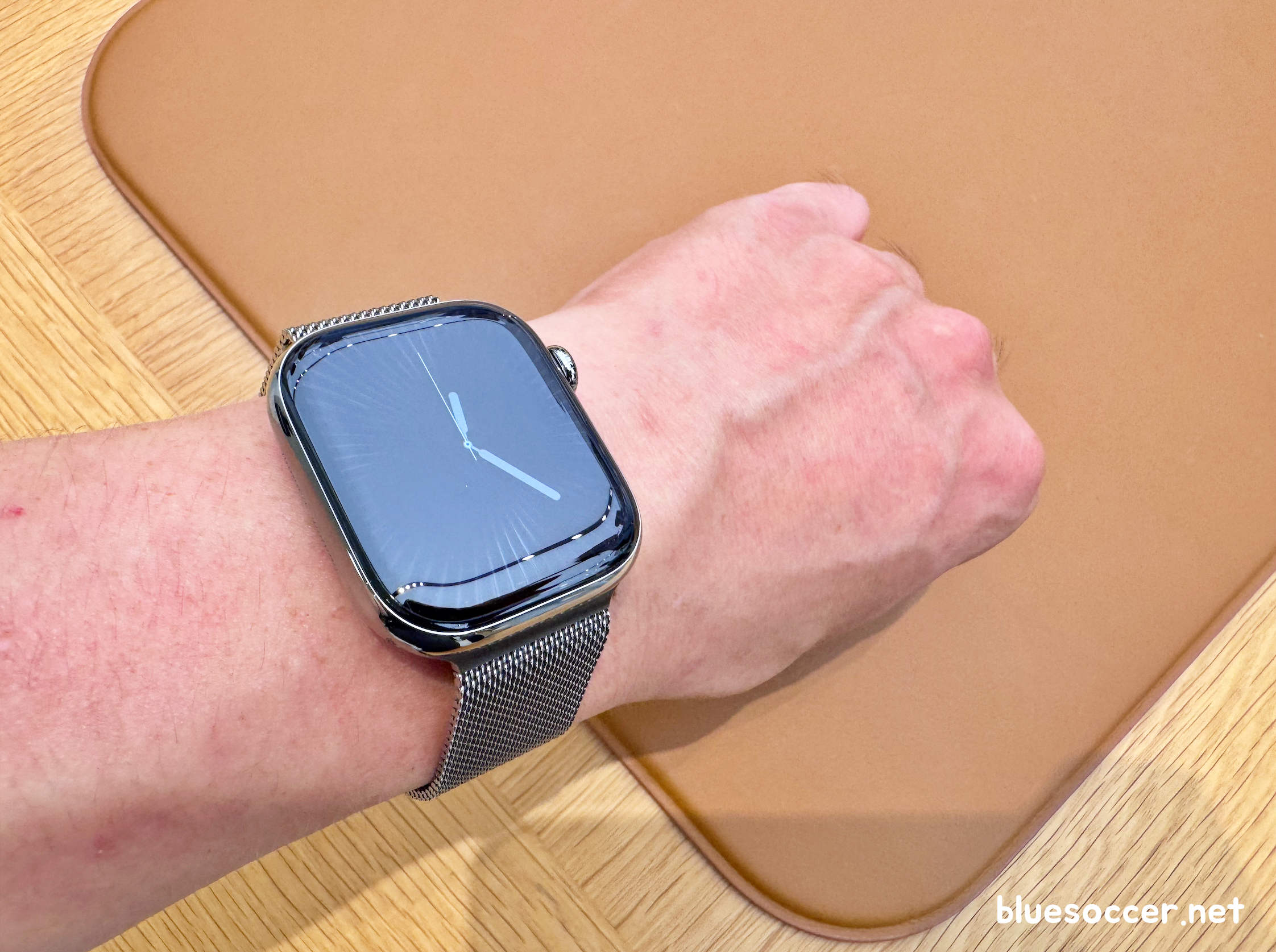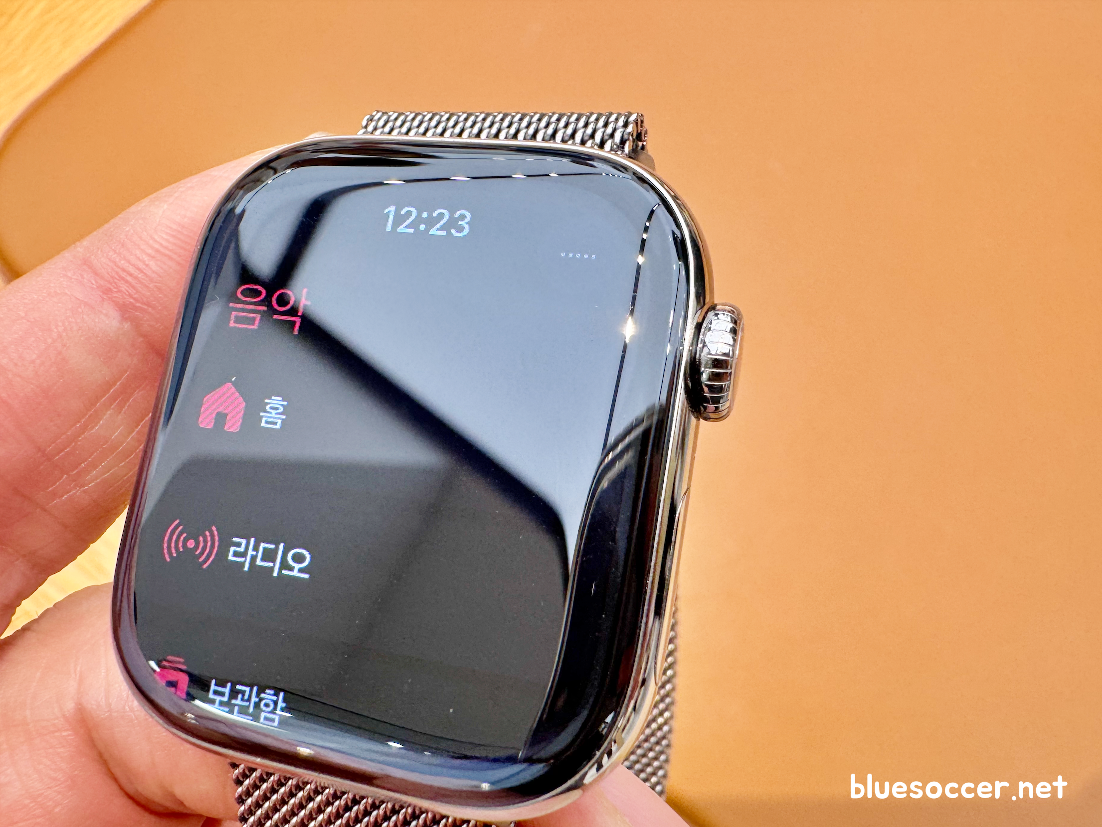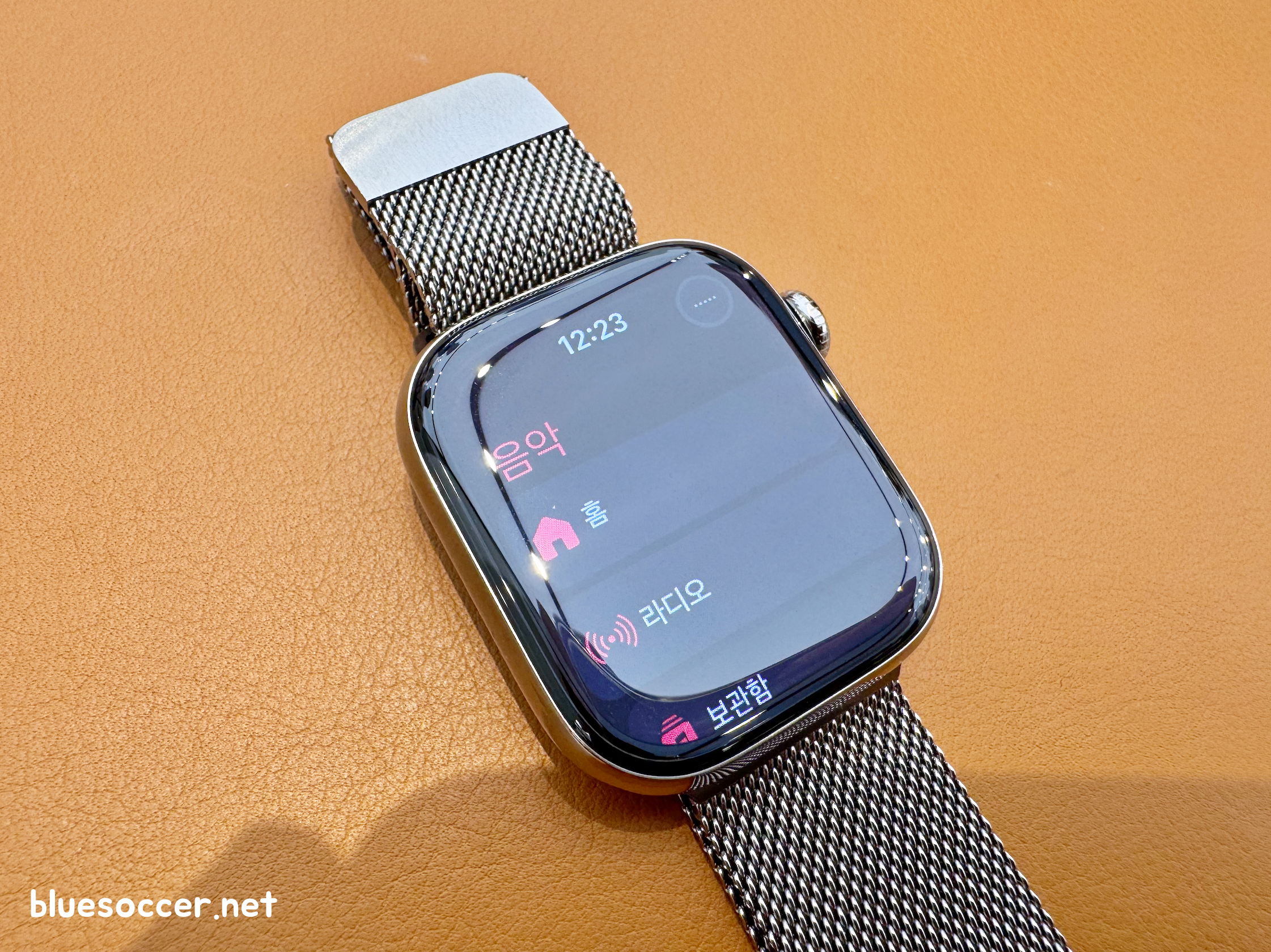 애플워치10 티타늄 내추럴 42mm 모델 실물 모습입니다. 제가 직접 봤던 제품입니다. 무엇보다 첫인상부터 마음에 들었습니다. 디스플레이가 커졌습니다. 베젤이 얇아지면서 디스플레이 영역이 많이 확보됐습니다. 이전에 출시됐던 제품들에 비해 베젤이 넓어졌음을 실감합니다. 어쩌면 기존에 애플워치 사용했던 분들 중에서 애플워치10 티타늄 실물 살펴보며 이 부분에 감탄하는 분이 꽤 있을 것으로 예상합니다. 여기에 와이드 앵글 OLED 디스플레이 적용으로 선명한 화질을 나타냅니다. 이는 애플워치 최초이며, 비스듬한 각도에서 바라볼 경우 전작보다 밝기가 40% 더 높아졌습니다. 체감상으로도 지금까지 봤던 애플워치 중에서 가장 밝았습니다.