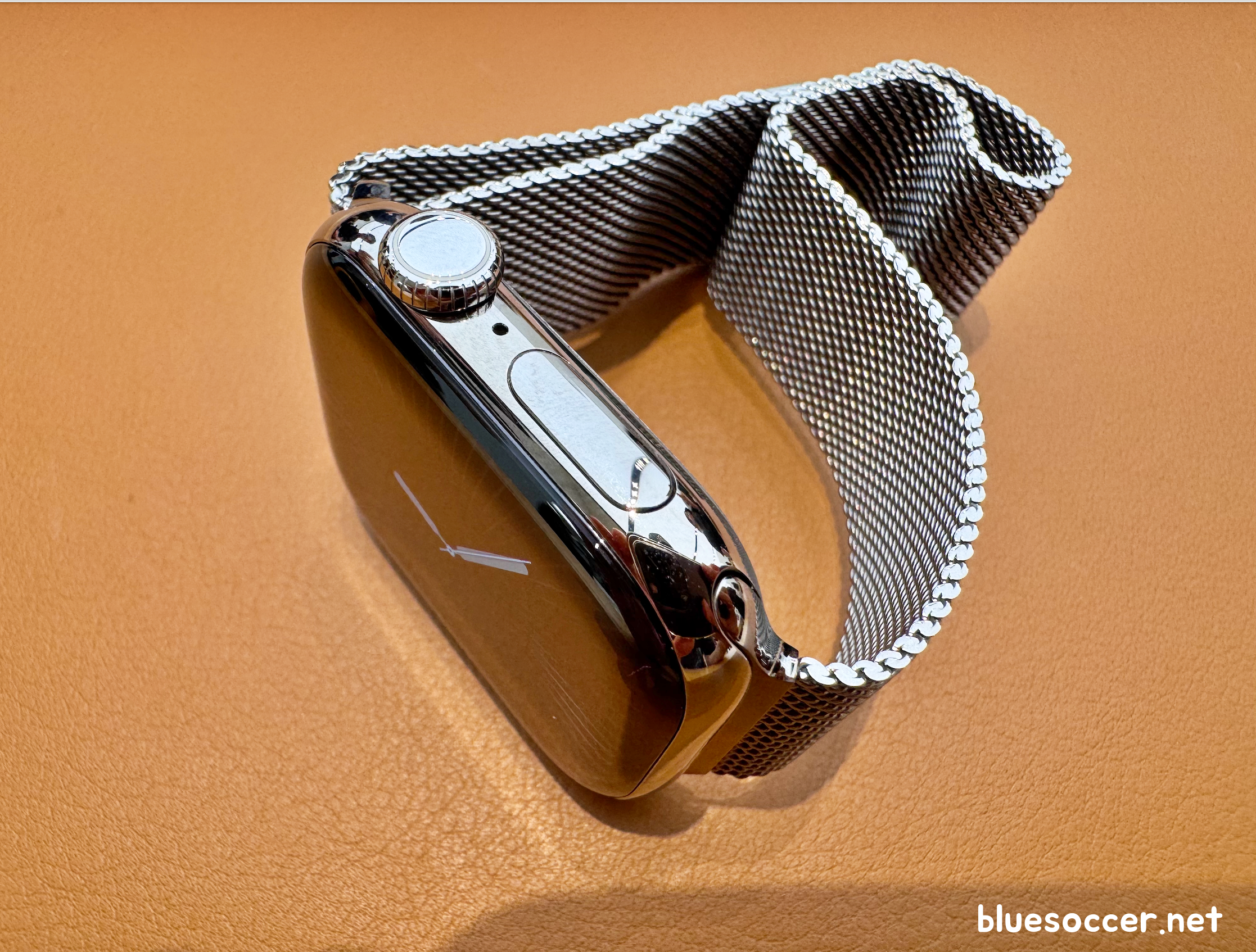 애플워치10 티타늄 내추럴 색상 입니다. 테두리에 은색 느낌이 많이 났던 제품입니다. 밴드는 내추럴 계열의 밀레니즈 루프와 함께하면 잘 어울릴 겁니다. 실제로 테두리를 보면 유광입니다. 주변 모습이 잘 보입니다. 왼쪽에 스피커가 있는 모습도 눈에 띕니다. 아이폰을 이용하지 않아도 음악 듣기 좋은 장점이 있습니다.