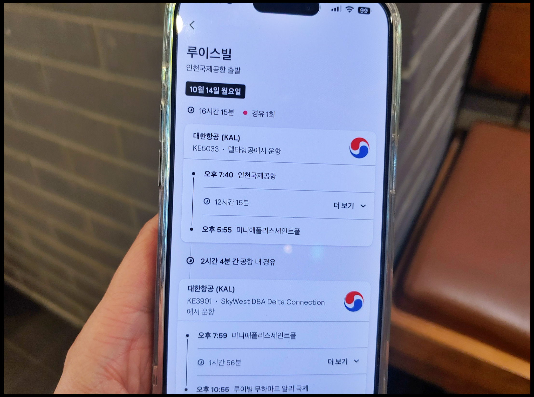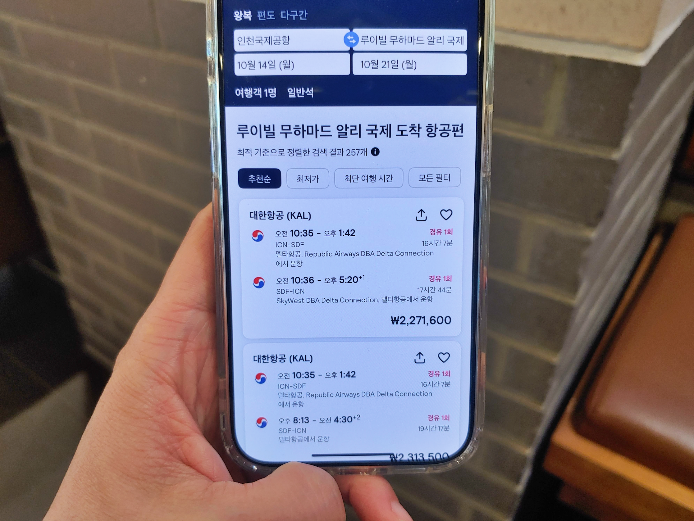 [사진 = 에드워드 리 식당 루이빌에 있습니다. 그곳에는 유명 복서 무하마드 알리 이름이 들어가는 국제공항이 있습니다. 그가 한국과 미국을 오가면서 어느 비행기를 이용했는지 알 수 없지만, 스카이스캐너 인천 루이빌 항공권 주요 노선을 보면 경유 시간이 촉박했을 것으로 예상됩니다. 비행기 경유 경험이 있는 분들은 아시겠지만, 경유 시간이 짧다고 좋은게 아닙니다.(제가 미국 공항에서 직접 봤던 모습인데, 공항 측 사정으로 경유 비행기 못타는 상황이 벌어질 수도 있음.) 루이빌이 아닌 다른 도시에서 한국으로 가는 비행기 탑승했을지라도 그 경로가 만만치 않을 겁니다. 여기서 항공권 언급한 것은, 그가 한국과 미국을 오갔던 일정이 얼마나 빡셌는지 보여주기 위해서입니다. (C) 스카이스캐너 앱]
