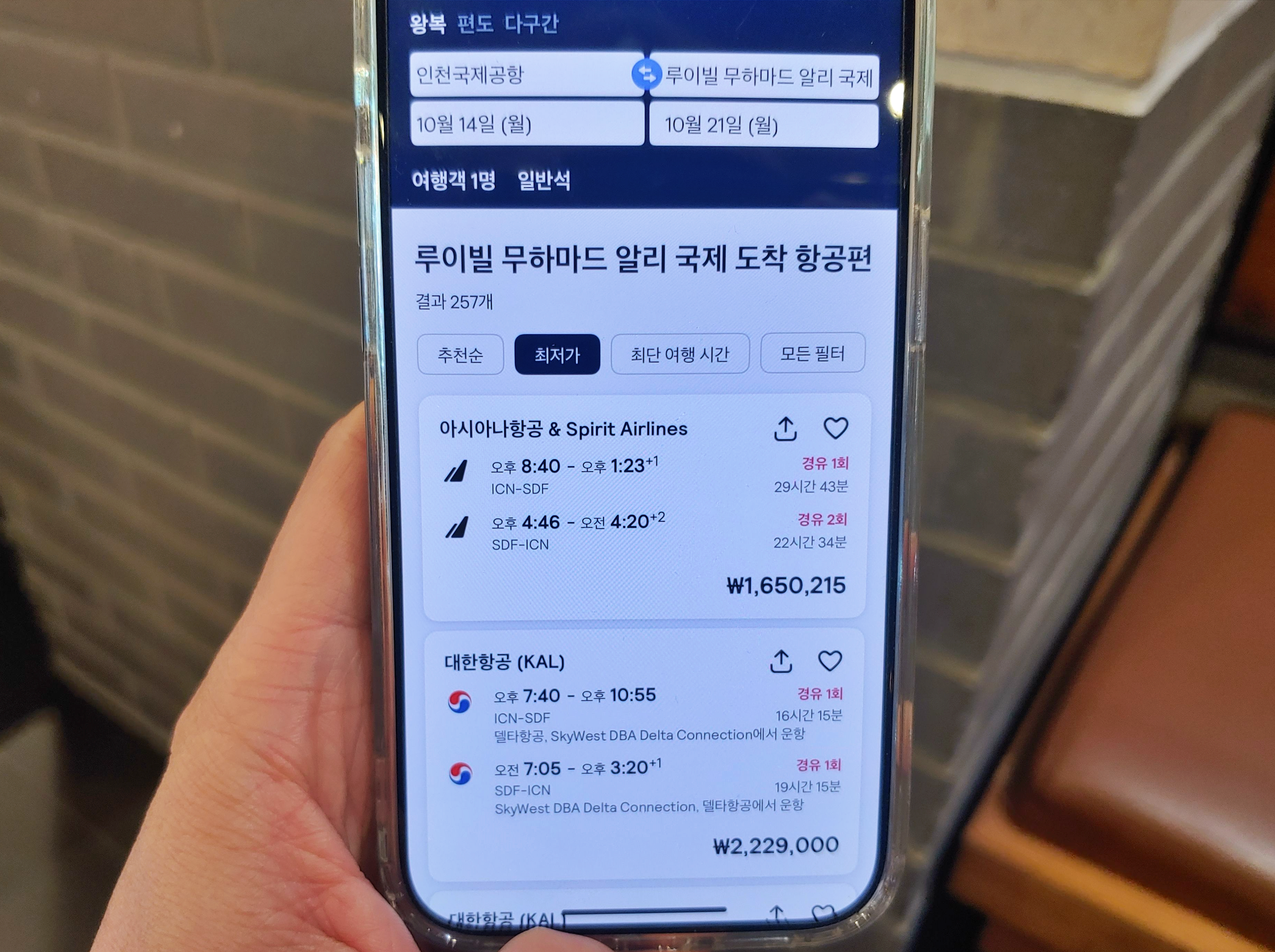 [사진 = 에드워드 리 식당 루이빌에 있습니다. 그곳에는 유명 복서 무하마드 알리 이름이 들어가는 국제공항이 있습니다. 그가 한국과 미국을 오가면서 어느 비행기를 이용했는지 알 수 없지만, 스카이스캐너 인천 루이빌 항공권 주요 노선을 보면 경유 시간이 촉박했을 것으로 예상됩니다. 비행기 경유 경험이 있는 분들은 아시겠지만, 경유 시간이 짧다고 좋은게 아닙니다.(제가 미국 공항에서 직접 봤던 모습인데, 공항 측 사정으로 경유 비행기 못타는 상황이 벌어질 수도 있음.) 루이빌이 아닌 다른 도시에서 한국으로 가는 비행기 탑승했을지라도 그 경로가 만만치 않을 겁니다. 여기서 항공권 언급한 것은, 그가 한국과 미국을 오갔던 일정이 얼마나 빡셌는지 보여주기 위해서입니다. (C) 스카이스캐너 앱]