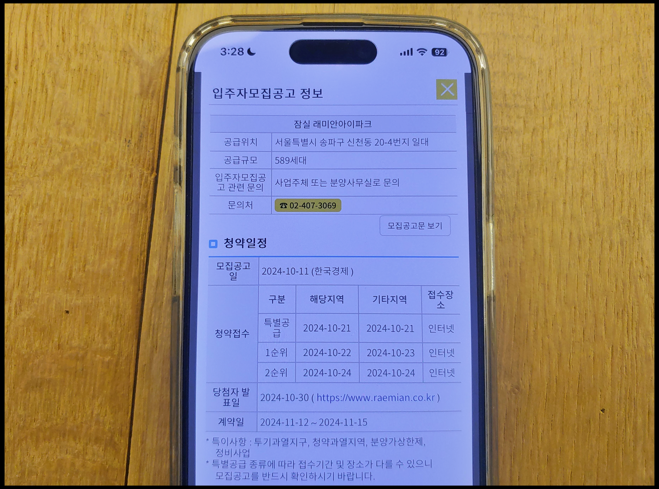 [사진 = 잠실 래미안 아이파크 청약 일정 이렇습니다. 특별공급 10월 21일 월요일, 일반공급 1순위 해당 지역 10월 22일 화요일 및 기타 지역 10월 23일 수요일, 2순위 10월 24일 목요일입니다. 당첨자 발표일 10월 30일 수요일, 서류접수 11월 3일 일요일 ~ 11월 7일 목요일, 계약체결일 11월 12일 화요일 ~ 11월 15일 금요일 입니다. 잠실 래미안 아이파크 일반분양 589세대 중에 일반공급 307세대 및 특별공급 282세대입니다. 특별공급 282세대 중에는 신혼부부 101세대, 다자녀가구 58세대, 기관추천 56세대, 생애최초 50세대, 노부모부양 17세대 입니다. (C) 청약홈 앱]