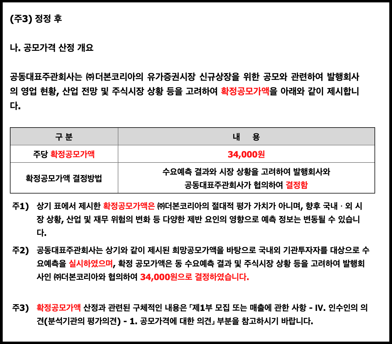 [사진 = 더본코리아 공모가 34,000원 확정됐습니다. 적용 PER 15.78배는 비교회사 PER 산출을 통해서 선정되었는데, 이 종목의 주당 평가가액 30,465원으로 산출됐습니다. 과연 적용 PER이 옳게 반영되었는지는 상장 첫 날 추이를 봐야 알 것 같습니다. (C) DART 공식 홈페이지]