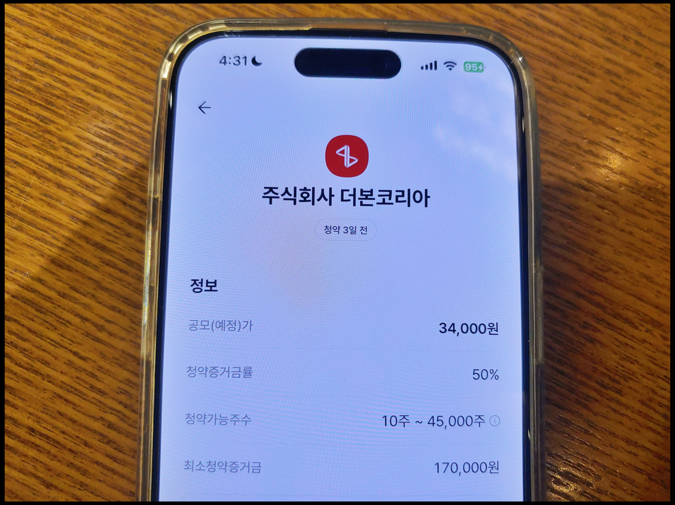 [사진 = 더본코리아 공모가 34,000원 및 최소 청약 증거금 170,000원, 청약신청일 10월 28일 ~ 29일(한투 : 오전 10시 ~ 오후 4시), 환불일 10월 31일, 상장일 11월 6일 등을 기억하시면 좋습니다. 한국투자증권 및 NH투자증권 통해서 청약 신청 가능합니다. 해당 기업의 높은 인지도 때문에 평소보다 더 많은 사람이 신청할 가능성 잠재적으로 존재합니다. 이 부분이 청약건수 증가로 이어지면 균등 배정 추첨 가능성 점점 올라갑니다. (C) 한국투자증권 앱]