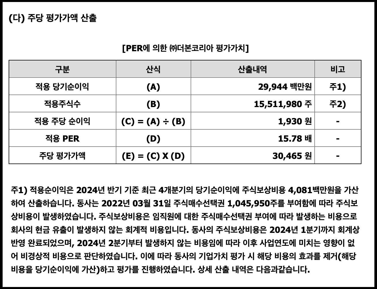 [사진 = 더본코리아 공모가 34,000원 확정됐습니다. 적용 PER 15.78배는 비교회사 PER 산출을 통해서 선정되었는데, 이 종목의 주당 평가가액 30,465원으로 산출됐습니다. 과연 적용 PER이 옳게 반영되었는지는 상장 첫 날 추이를 봐야 알 것 같습니다. (C) DART 공식 홈페이지]