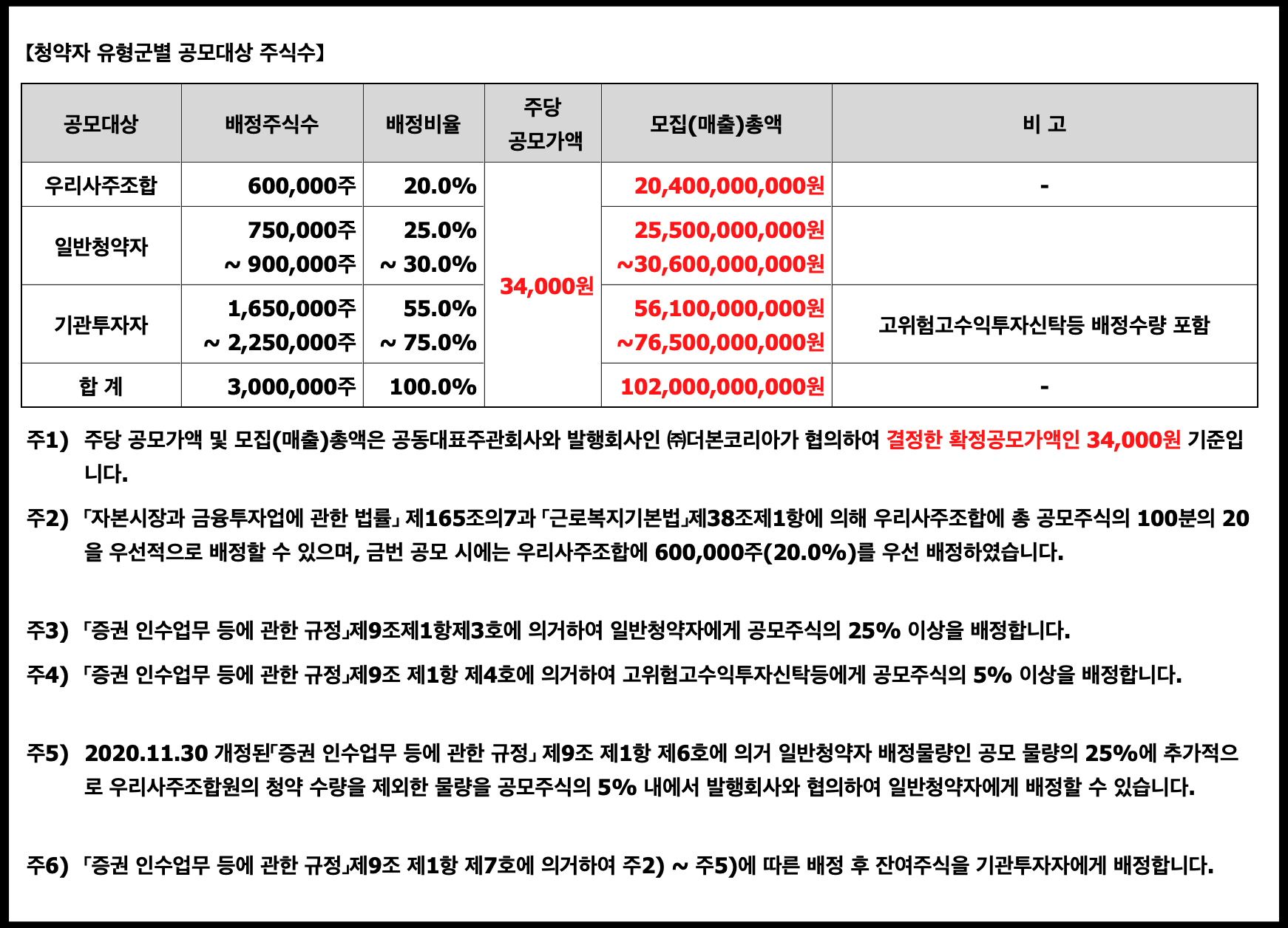 - 균등 및 비례 배정 수량 : 225,000주 ~ 270,000주 (한투) 150,000주 ~ 180,000주 (NH)