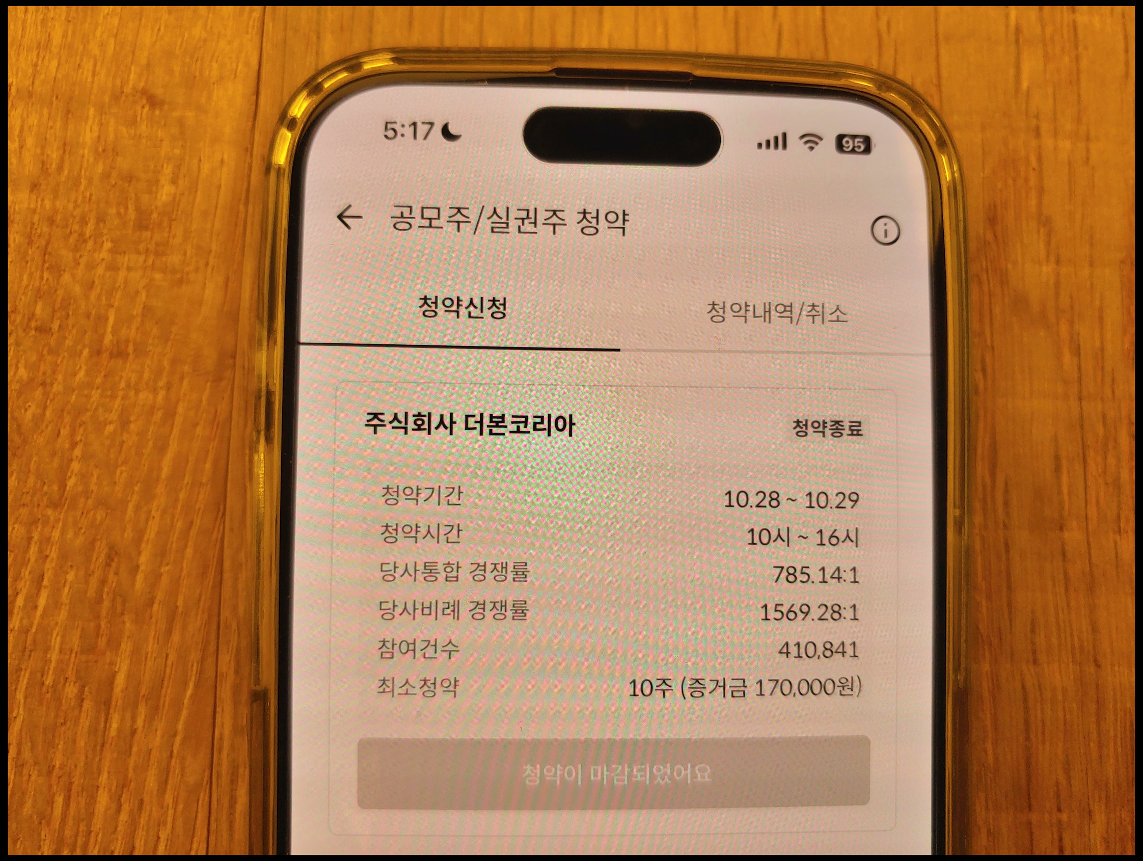 [사진 = 더본코리아 환불일 10월 31일 목요일입니다. 그 이전인 10월 30일 내일이 되면 균등 배정 결과 공개됩니다. 대략 100명 중에서 3분의 2 해당되는 분만 1주 배정 받을 수 있습니다. 청약 신청자가 많으면서 반대로 1인당 균등 배정 수량이 적어졌습니다. 이 종목의 상장일은 11월 6일 입니다. 최소 1주 배정 받으신 분들은 오전 9시 국내장 시작하면 주가 추이 어떻게 되는지 많이 주목하실 겁니다. 이 종목 수급이 들어오게 된다면 과연 탄력적으로 쭉쭉 뻗어줄지 여부가 주목됩니다. 주식 1주 이상 보유하신 분들이 상장 첫 날에 가장 기대하는 포인트입니다. (C) 글쓴이 아이폰]