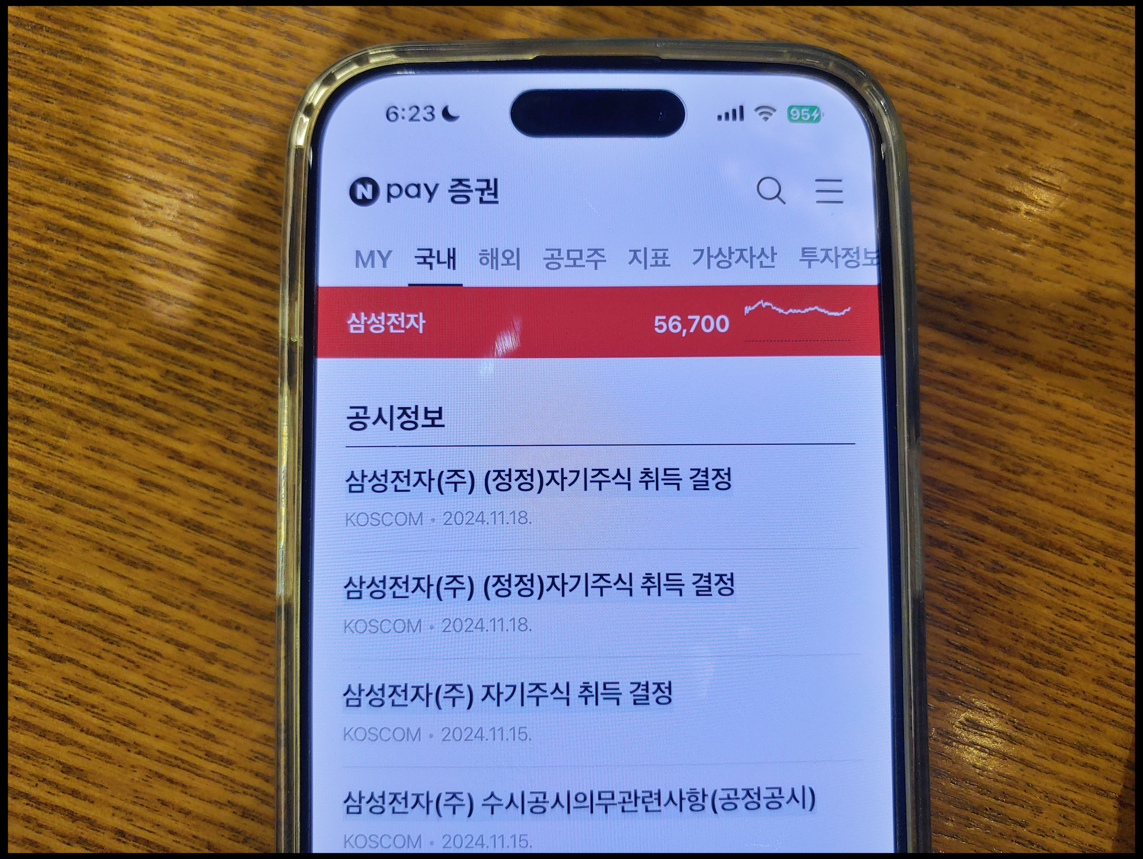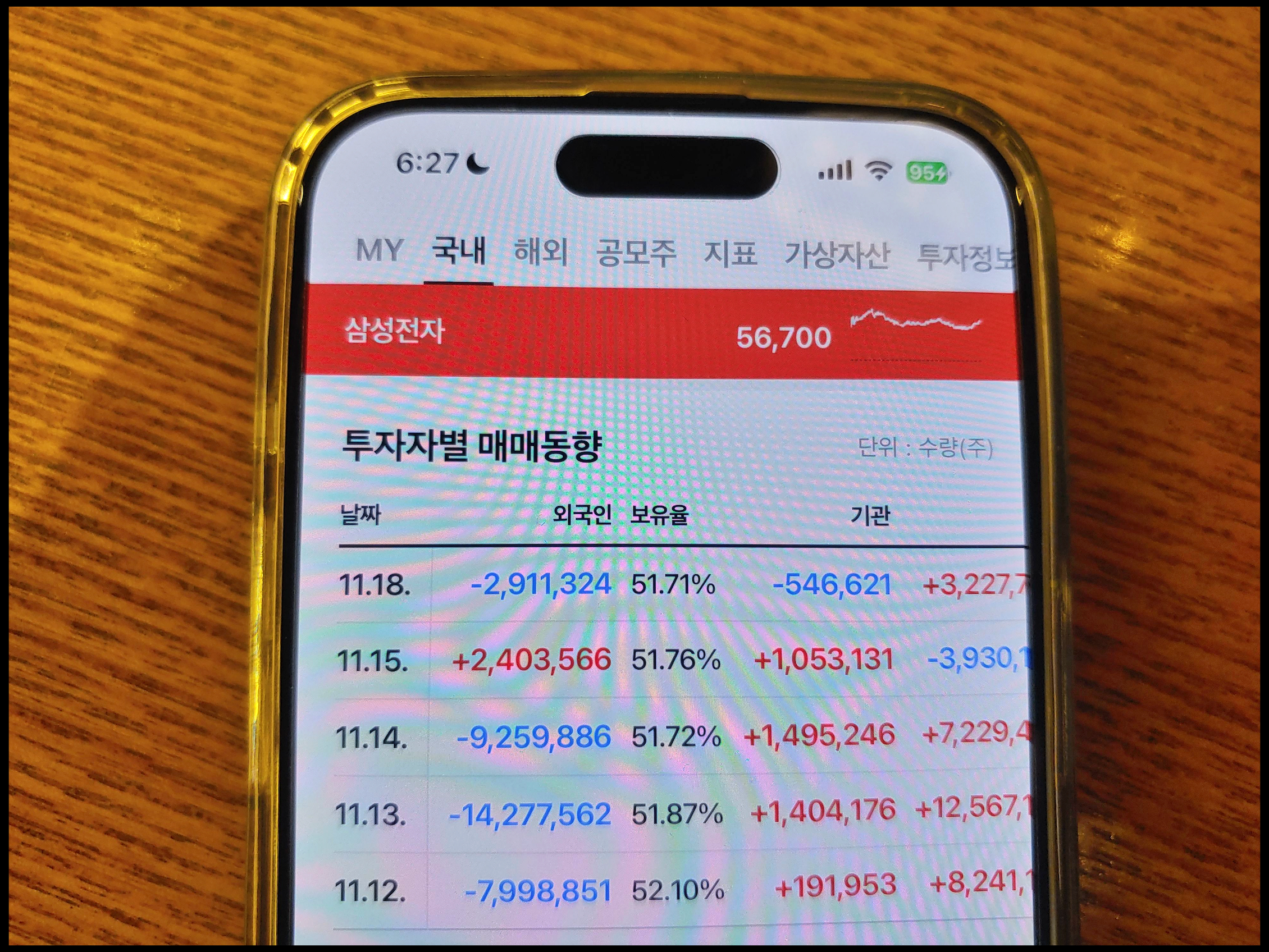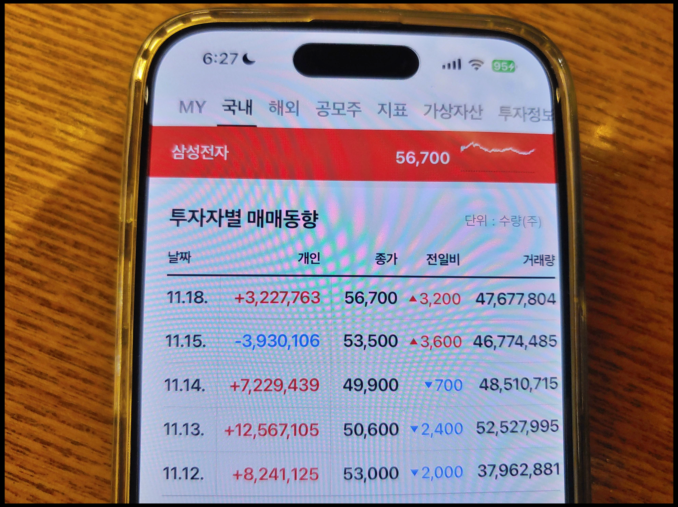 [사진 = 저를 포함한 많은 분들이 토스증권 통해서 삼성전자 주가 알림 접했습니다. 특히 11월 14일 49,900원 1년 중 최저가 알림이 전해졌던 순간이 지금도 기억납니다. 그러다가 11월 18일 오전에 57,000원 올랐다는 알림이 떴습니다. 삼성전자 자사주 매입 효과에 의해 주가 흐름이 오름세로 전환됐습니다. 특히 외국인들이 저가 매수를 하면서 이 종목의 주가 흐름에 긍정적 영향을 끼쳤습니다. (C) 글쓴이 스마트폰]
