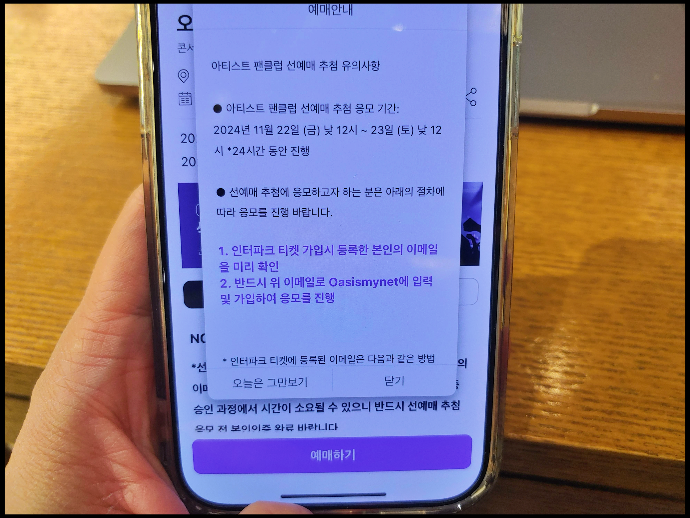 [사진 = 오아시스 내한 티켓팅 선예매 Oasismynet이라는 아티스트 팬클럽 페이지에서 가능합니다. 추첨 형태로 당첨자 선정됩니다. 11월 22일 정오부터 23일 정오까지 24시간 동안 진행됩니다. 인터파크 티켓 가입 시 등록했던 자신의 이메일 미리 확인한 뒤, 그 이메일을 해당 사이트에 입력해서 응모하셔야 합니다. 만약 그 이메일이 같지 않으면 선예매 인증 실패됩니다. 이러한 조건 지키시면 좋습니다. (C) 인터파크 티켓 앱]