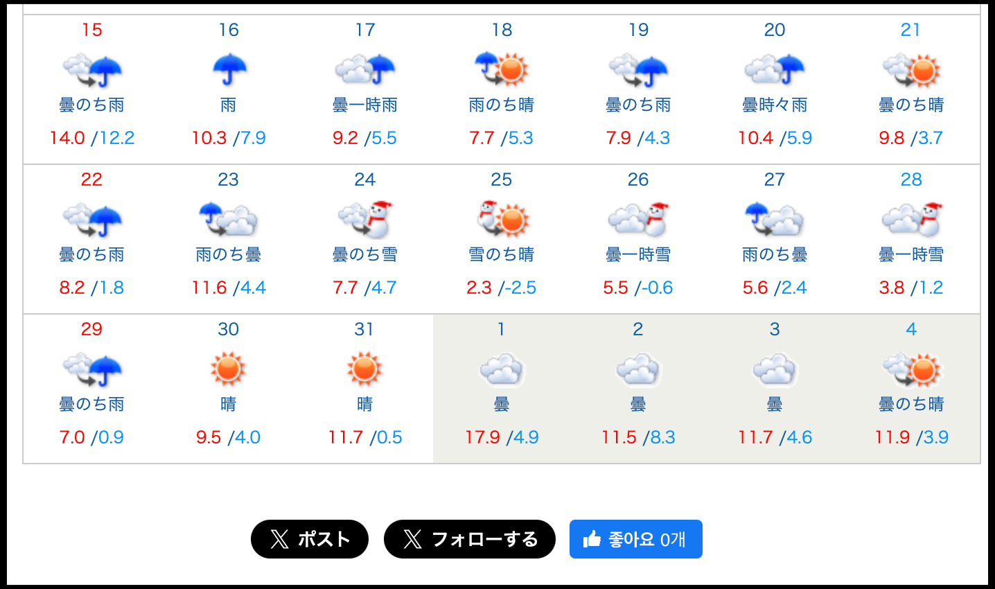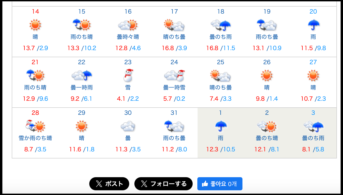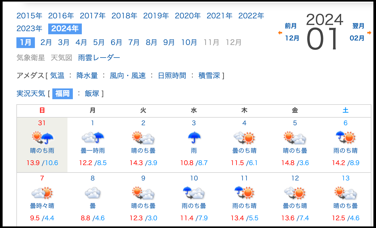 [사진 = 2024년 일본 후쿠오카 1월 날씨 이렇습니다. 영하로 내려간 날이 없습니다. 전반적으로 한국보다 날씨가 따뜻한 편이며, 눈이 내리는 날도 적었습니다. 최고 기온 영상 10도 이상 기록했던 날이 많습니다. (C) 일본 기상협회 홈페이지(tenki.jp)]