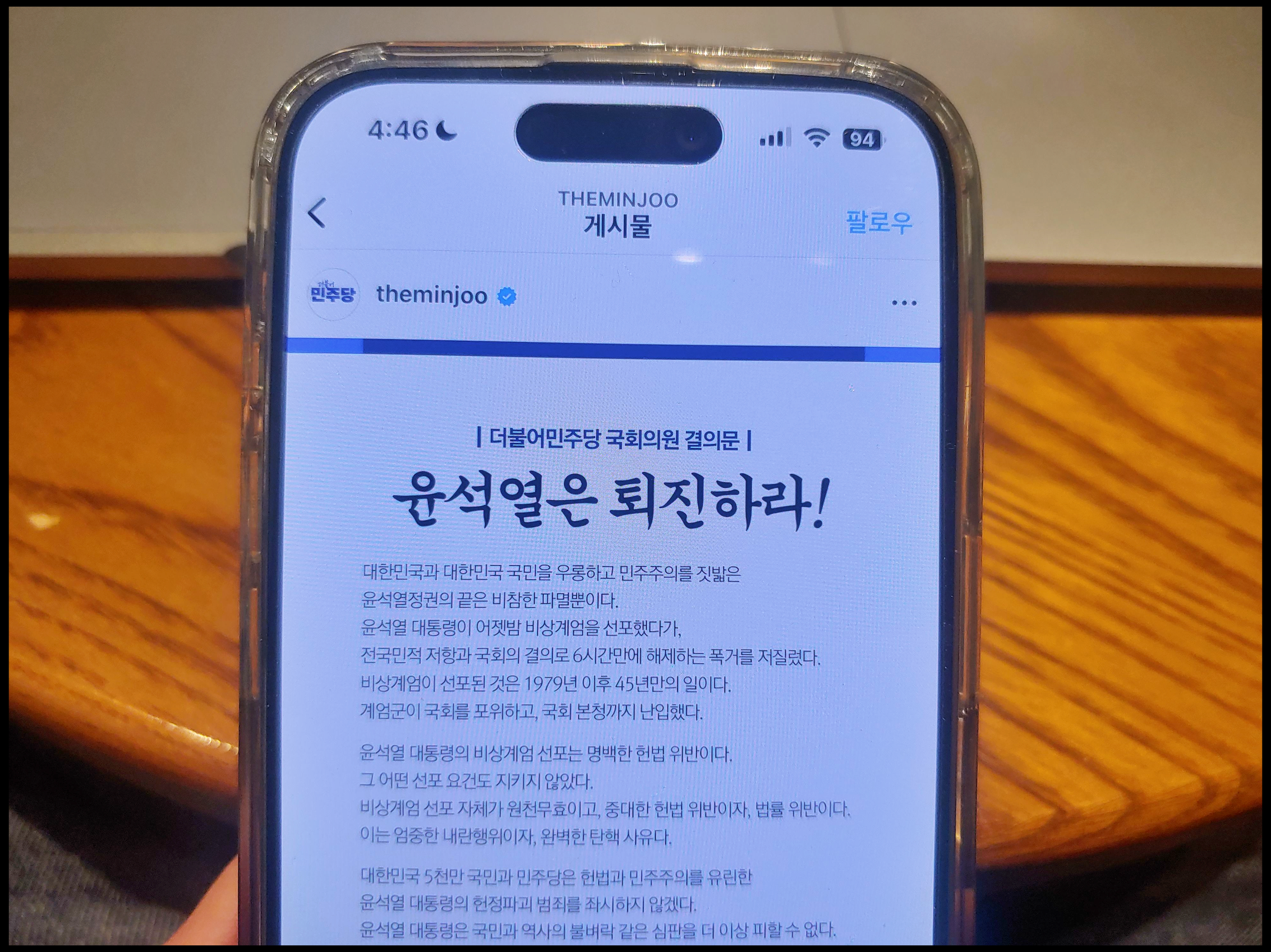 [사진 = 국회 다수당(170석) 더불어민주당은 12월 4일 국회의원 결의문 공개했습니다. 현 대통령의 비상계엄 선포는 명백한 헌법 위반이라고 언급했으며, 그 어떤 선포 요건도 지켜지지 않았다고 합니다. 비상계엄 선포는 원천 무효, 중대한 헌법 위반, 법률 위반, 엄중한 내란 행위, 완벽한 탄핵 사유라는 입장을 전했습니다. (C) 더불어민주당 공식 인스타그램]