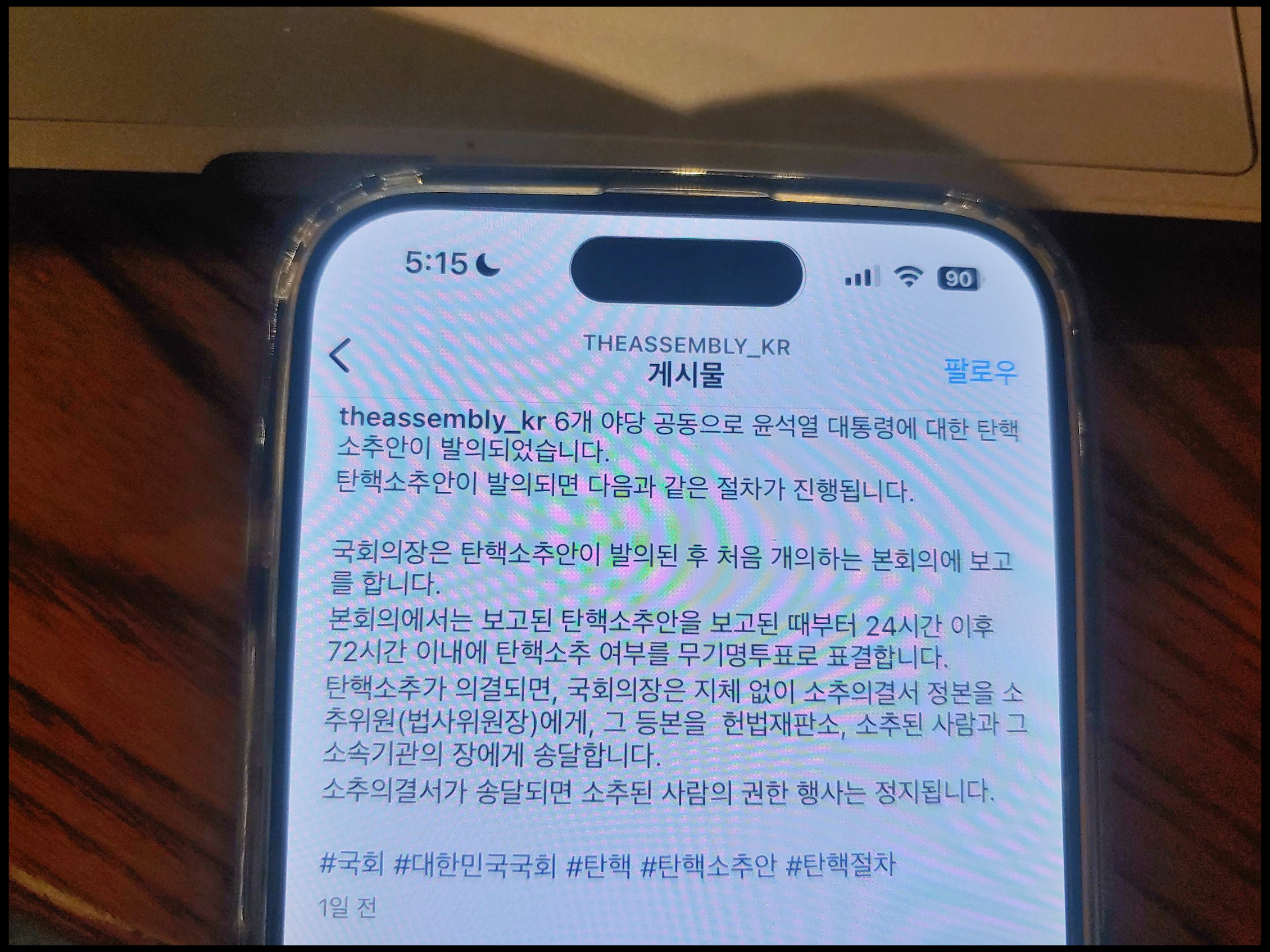 [사진 = 대한민국 국회 공식 인스타그램에서는 탄핵소추안 발의 시 절차에 대하여 언급했습니다. (C) 대한민국 국회 공식 인스타그램]