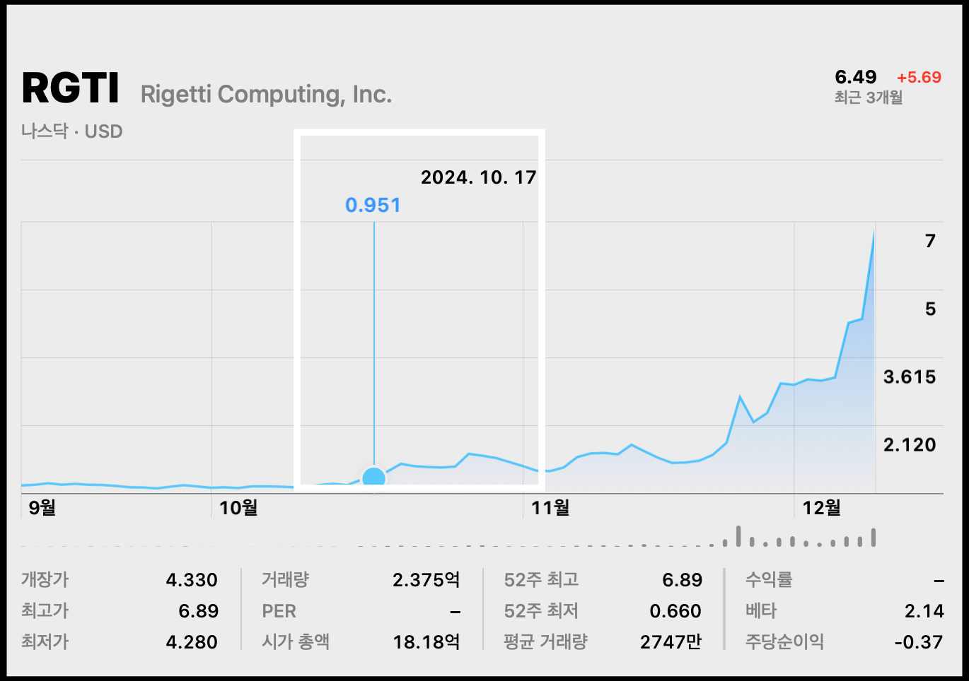 [사진 = 리게티 컴퓨팅 주가 지난 3개월 및 5년 추이 살펴보면 이렇습니다. 3개월 추이 통해서 2024년 10월 17일 0.951달러 기록했음을 알 수 있습니다. 다만, 5년 추이로 보면 팬데믹 시절에 비해서 크게 하락했습니다. 최근 6.49달러가 되면서 점점 회복중입니다. 3개월 추이만 놓고 보면 1달러 전후 기록했던 점이 눈에 띄지만 그 이전 과거를 보면 10달러 이상 기록했던 시절이 있었습니다. 결론적으로 RGTI 변동성이 큰 종목입니다. (C) 맥북 주식 앱]