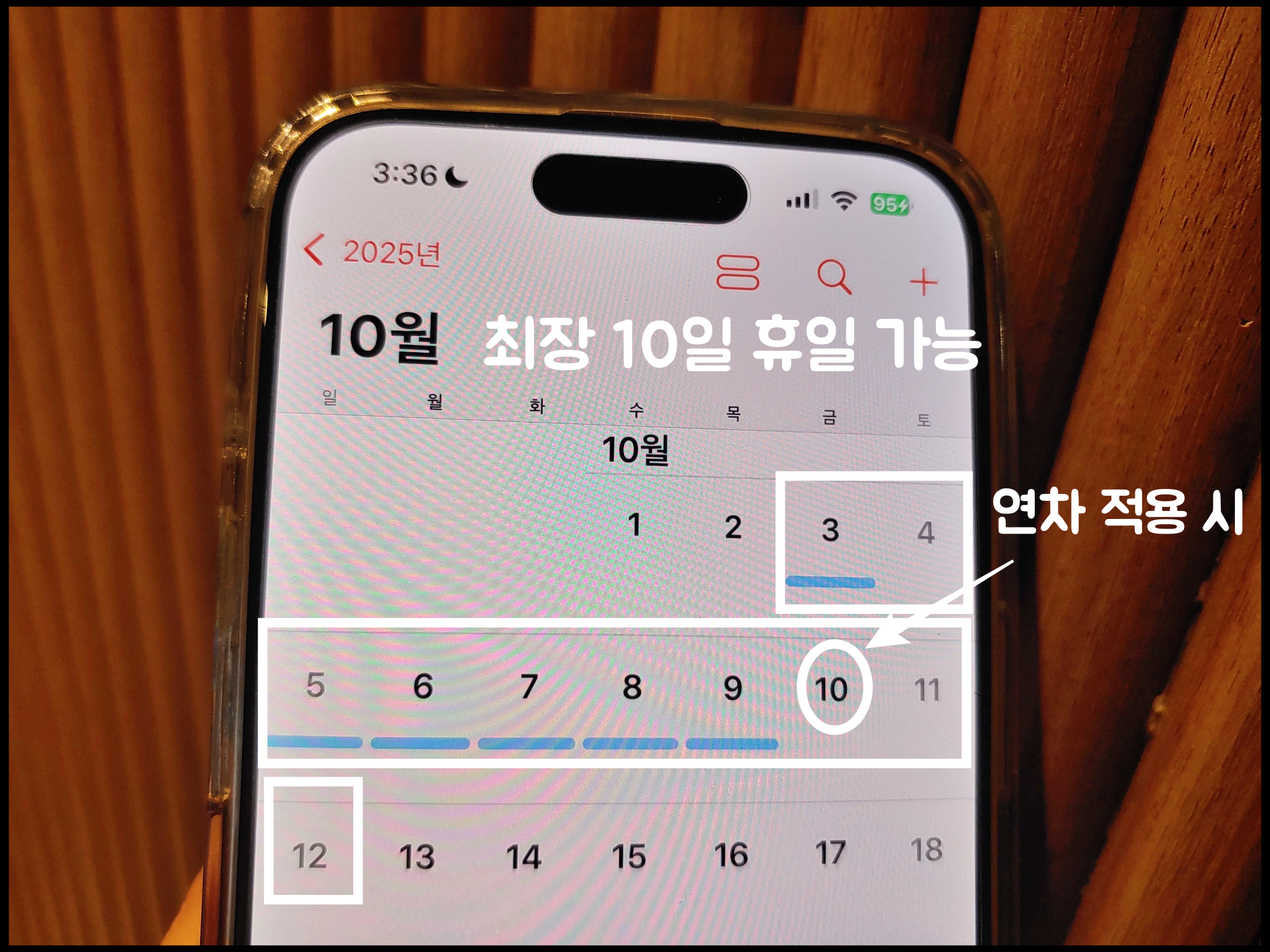 10월 3일(금) 개천절, 10월 4일(토) 주말, 10월 5~7일(일~화) 추석 연휴, 10월 8일(수) 대체공휴일, 10월 9일(목) 한글날, 10월 10일(금) 연차, 10월 11~12일(토~일) 주말. 총 10일