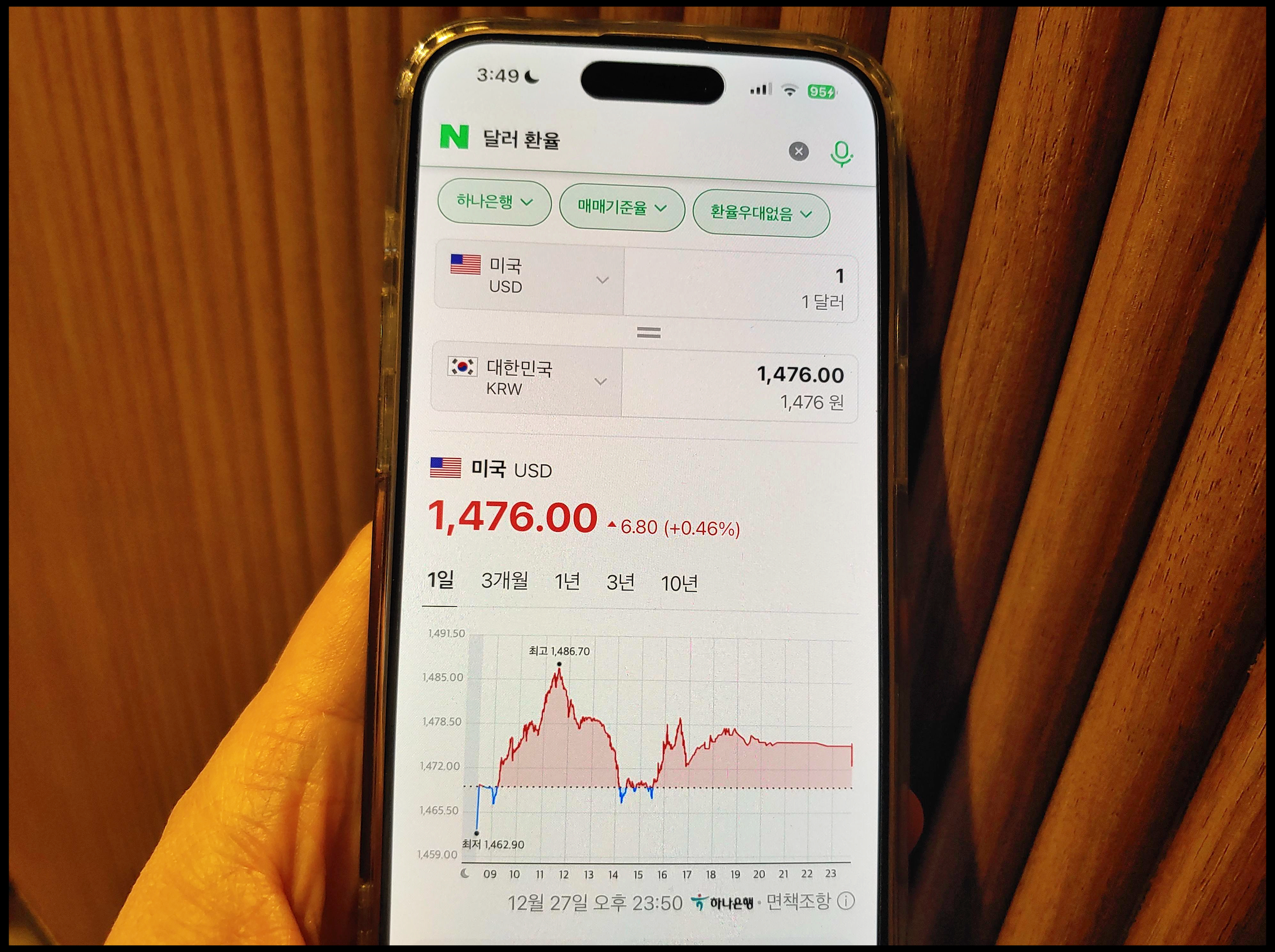 [사진 = 현재 달러 및 유로 환율. 이번 2025년에는 긴 연휴 기간들이 눈에 띕니다. 해외여행 떠나는 분이 많을 것으로 예상합니다. 하지만 변수는 환율입니다. 원화가치 폭락으로 달러 환율 한때 1,480원 넘었던 적이 있습니다. 12월 26일 1,476원으로 마무리했으나 이날 오전에 한때 1,486.7원까지 올랐습니다. 자칫 잘못하면 달러 환율 1,500원 넘어설 가능성까지 걱정해야 할판 입니다. 유로 환율도 최근 10년 기준 지금이 최고점입니다. 기간만 놓고 보면 2025년에는 해외여행 떠나기 좋은 시기인데 환율이 도와주지 않는 중입니다. 원화가치가 안정을 되찾아야 합니다. (C) 네이버 앱]