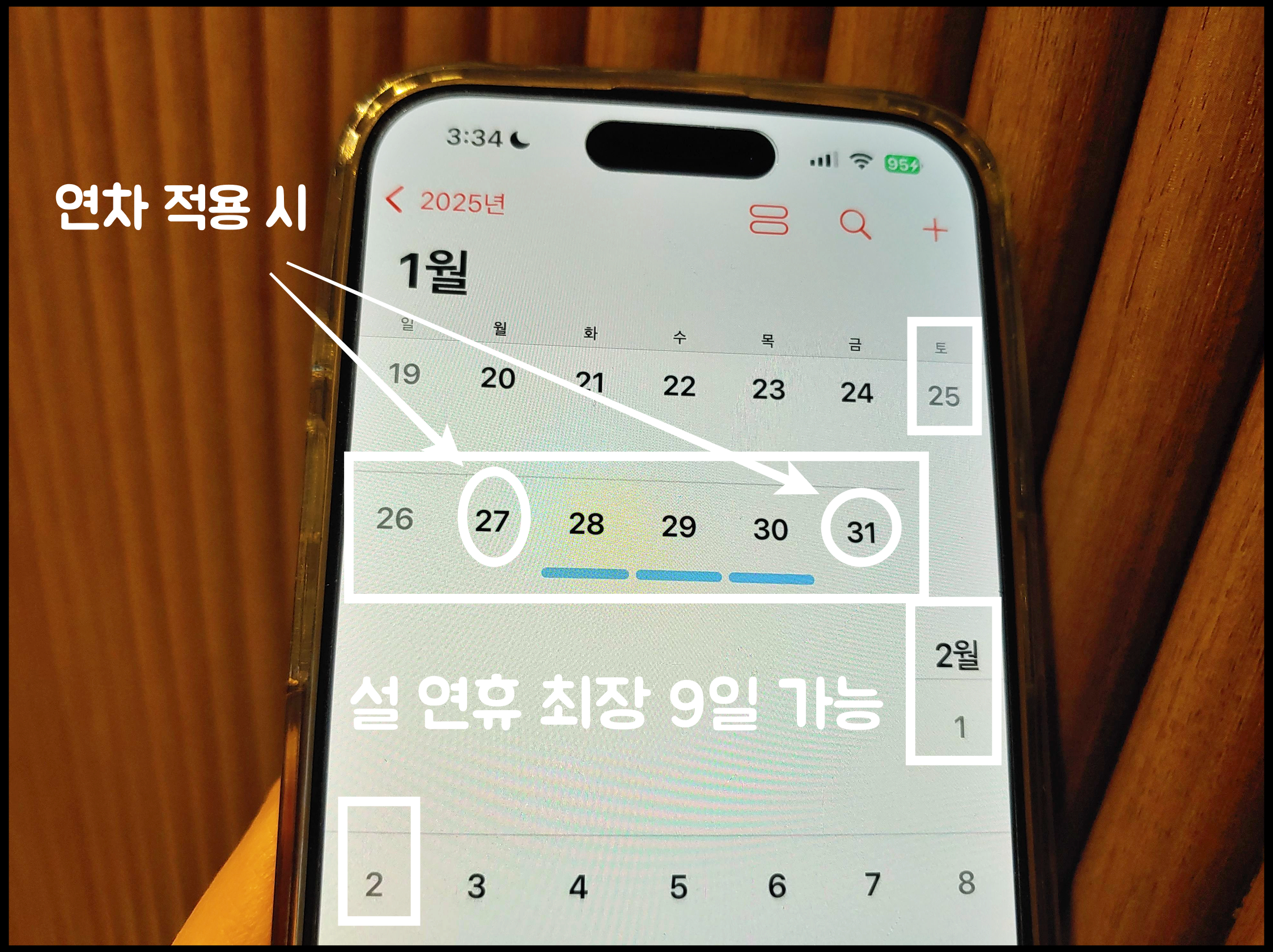 -1월 25~26일(토~일) 주말, 1월 27일 월요일 연차, 1월 28~30일(화~목) 설날 연휴, 1월 31일(금) 연차, 2월 1~2일(토~일) 주말. 총 9일