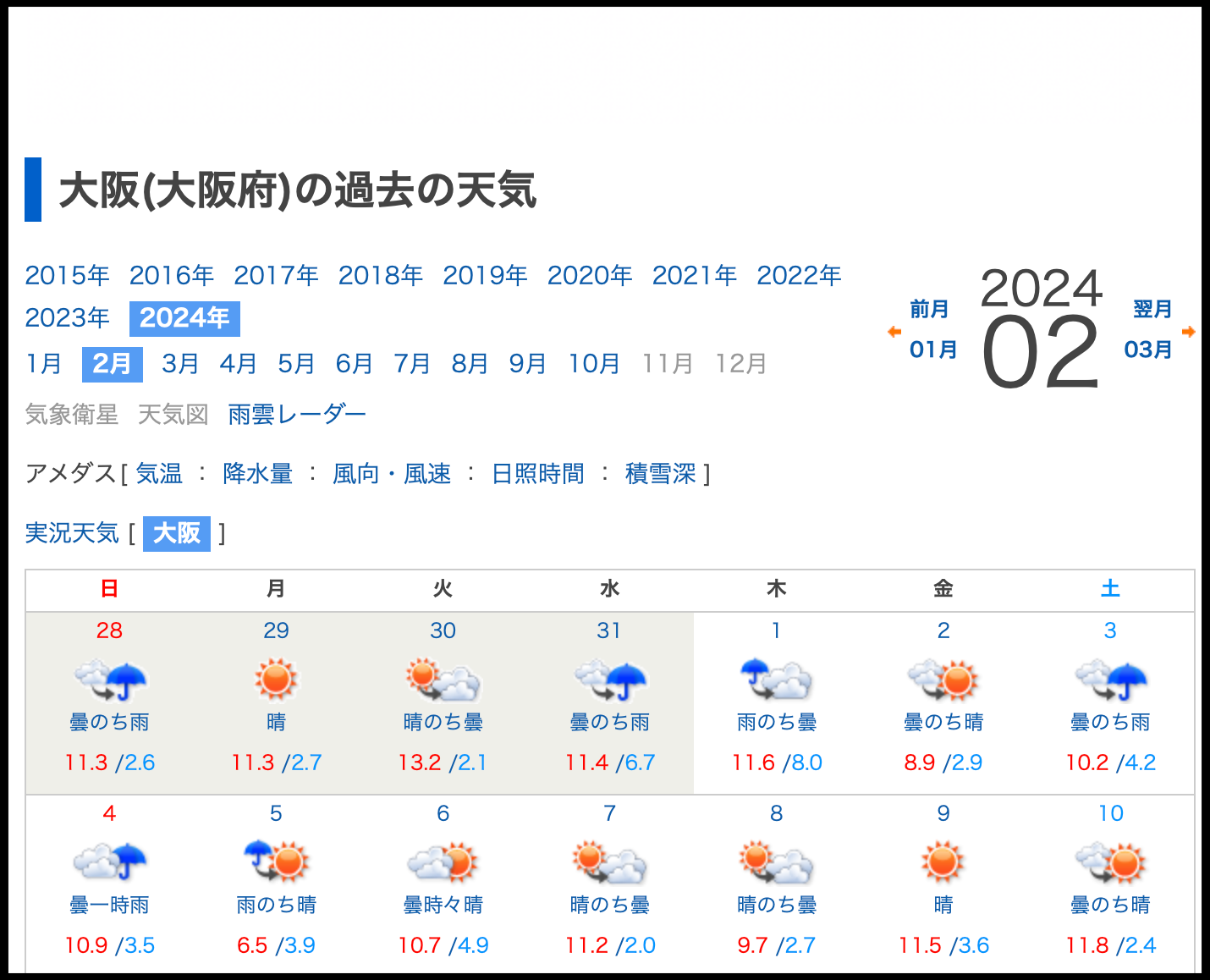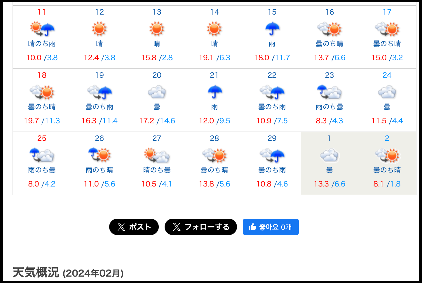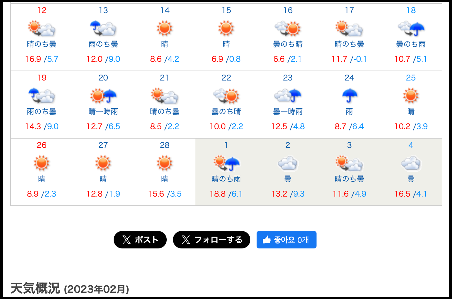 [사진 = 2023년 오사카 2월 날씨 이렇습니다. 이날 17일이 유일하게 최저 기온 영하로 내려갔습니다.(-0.1도) 그 외에는 모두 영상입니다. 이때는 최고 기온 10도 이상이었던 날이 19일 됩니다. 2024년에 비해 5일 정도 적었습니다. (C) 일본기상협회 홈페이지(tenki.jp)]