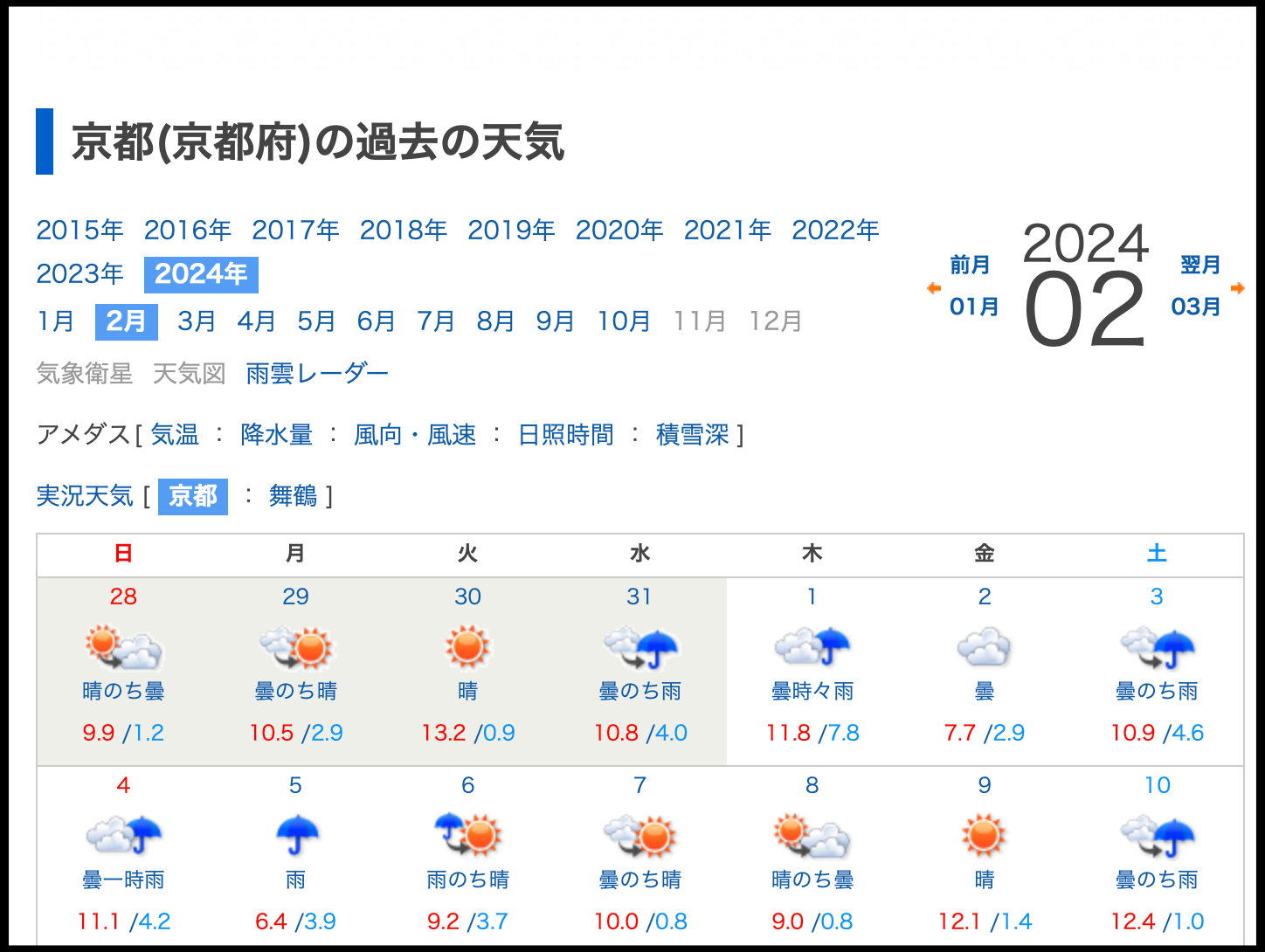 [사진 = 2024년 교토 2월 날씨 이렇습니다. 이곳은 오사카 바로 위에 있습니다. 오사카 여행가시는 분들 중에 교토도 들리는 경우가 많아서 이곳의 과거 날씨 올려봅니다. 최저 기온 5도 이하였던 날이 꽤 있습니다. 2월 14일에는 최저 기온 4.8도였는데 최고 기온 19.8도로서 편차가 컸습니다. 월말에 비가 오는 날이 많기도 했습니다. 오사카에 비하면 날씨가 다소 거칠었던 것 같습니다. 한국인들 중에 교토 여행갈 때 기모노 대여하는 분이 많은 것으로 압니다. 날씨에 따라서는 기모노 입기 안좋을 때가 꽤 있어서 현지 방문할 때의 기온 꼭 참고하셔야 합니다. (C) 일본기상협회 홈페이지(tenki.jp)]