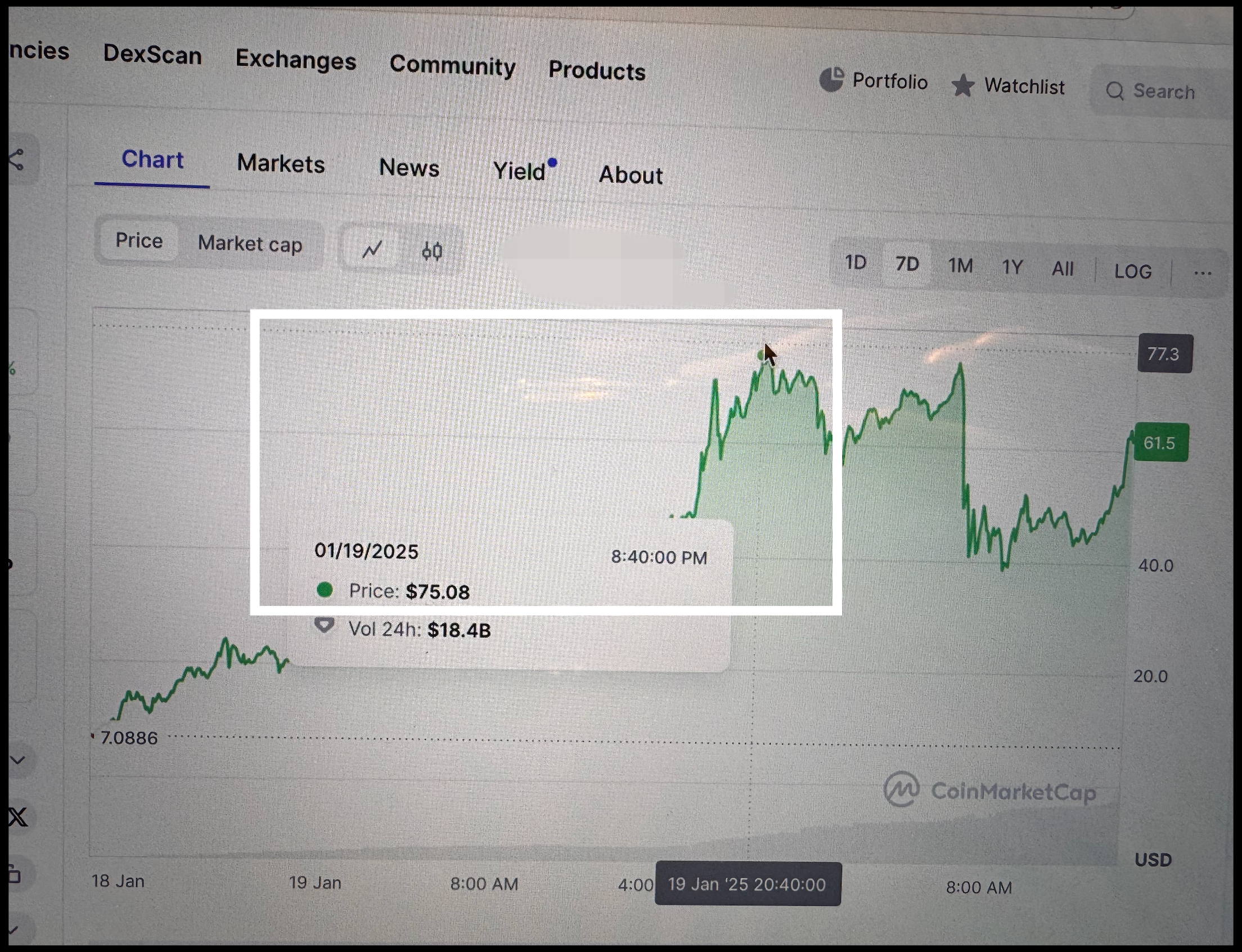 [사진 = 트럼프 밈코인 오피셜 트럼프 시세 변화가 큽니다. 1월 18일 오후 1시 30분 7.0885달러에서 다음날 오후 75.08달러까지 올랐다가 그 이후 40달러대로 내려갔더니 60달러 이상까지 올랐습니다. (C) 코인마켓캡 공식 홈페이지(coinmarketcap.com)]