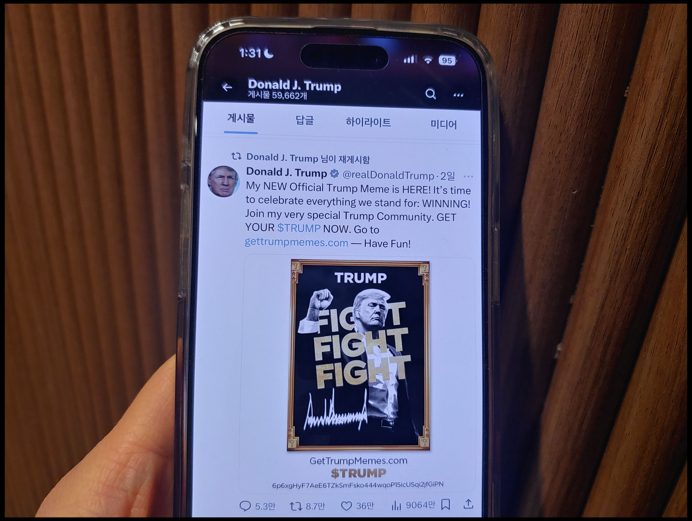 [사진 = 도널드 트럼프 미국 대통령 당선자는 지난 1월 18일 X(구 트위터)에 트럼프 밈코인 언급했습니다. "나의 새로운 공식 트럼프 밈이 여기 있다. 우리가 지지하는 모든 것을 축하할 때다. 승리!"라고 언급하면서 자신의 매우 특별한 트럼프 커뮤니티에 들어와달라며 해당 코인을 알렸습니다. 해당 게시물에 대하여 트럼프 대통령이 잘못 올렸거나 또는 해킹당한 것이 아니냐는 의심을 하는 시각이 있을지 모르지만, 그가 해당 게시물을 20일에 리트윗하면서 이를 즐기고 있음을 알 수 있습니다. 이 게시물 조회 수 9천만 뷰 및 좋아요 36만 회 입니다. 국제적으로 화제성이 높아졌습니다. (C) 도널드 트럼프 X(구 트위터)]
