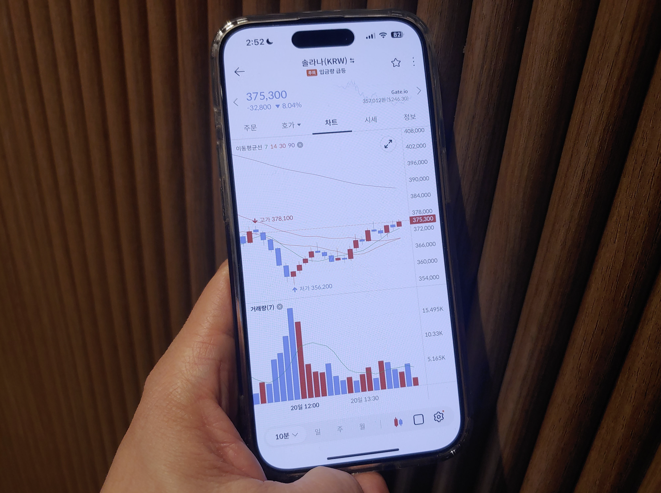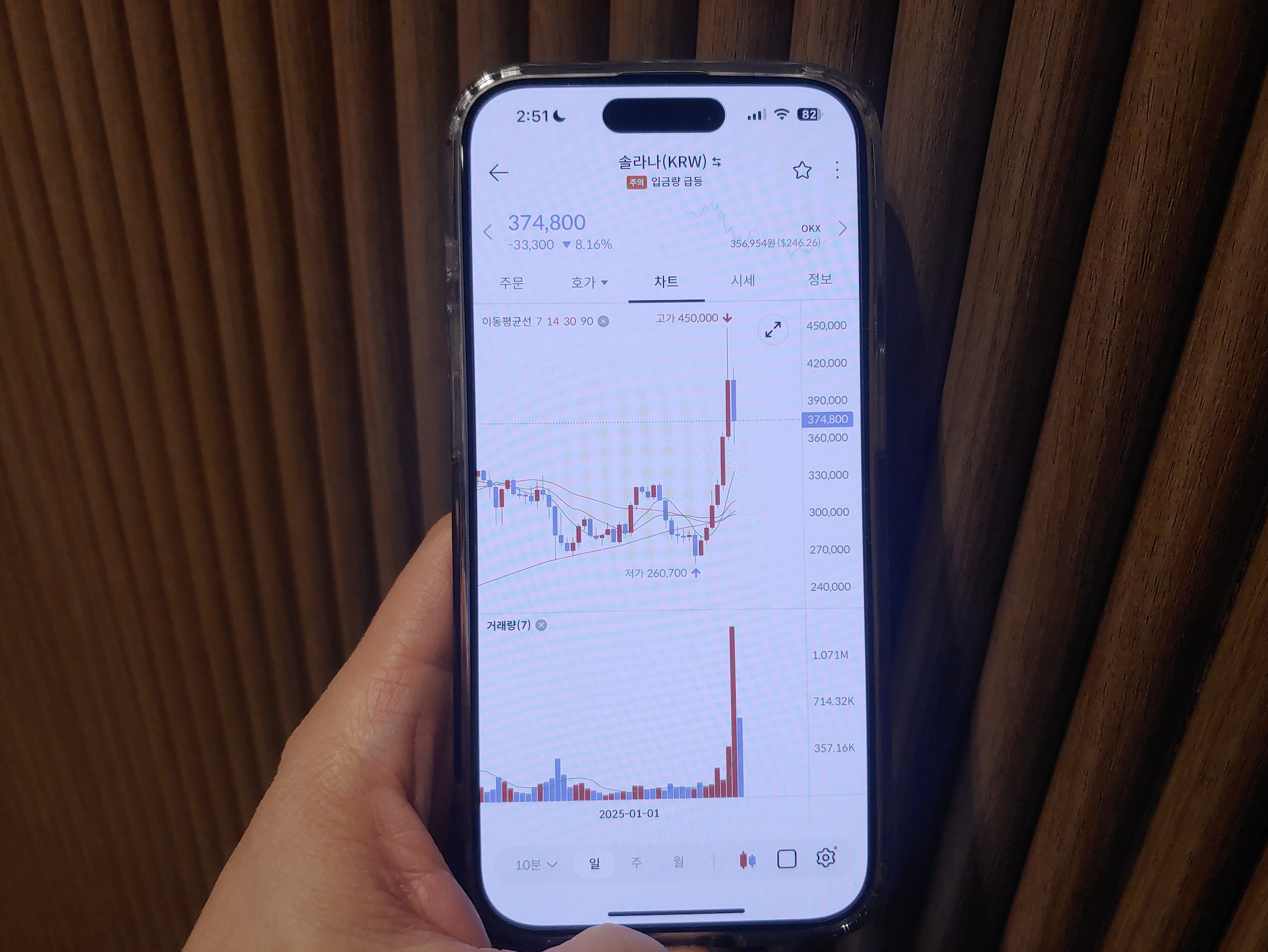 [사진 = 솔라나 코인 시세 빗썸 기준으로 1월 19일 저녁 450,000원까지 올랐습니다. 사상 최고치 기록 경신했습니다. 트럼프 밈코인 영향이 있었습니다. 그 이후에는 30만 원대 중반으로 밀렸다가 다시 후반으로 올라오는 중이며, 최근 거래량 급등했습니다. 이번 트럼프 이슈로 해당 코인에 대하여 인지했던 분이 많을 것으로 보입니다. (C) 빗썸 앱]