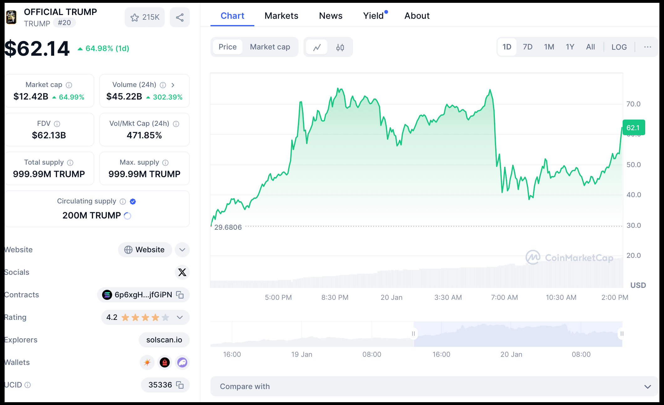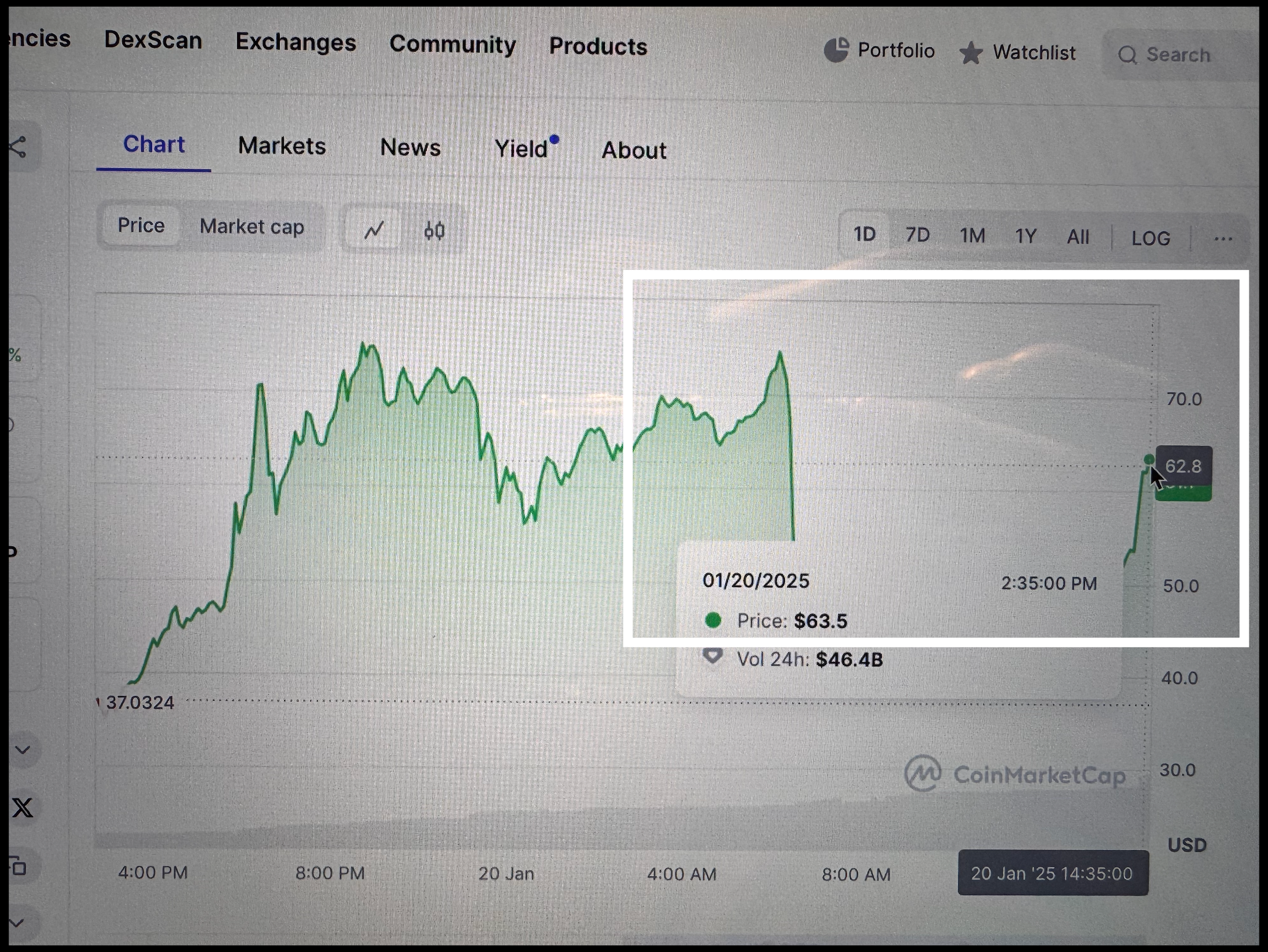 [사진 = 코인마켓캡에 올라온 오피셜 트럼프 코인 시세 입니다. 1월 20일 오후 2시 현재 기준으로서 62달러 조금 넘었습니다. 불과 오후 1시에는 45달러였는데 1시간 사이에 17달러 올랐습니다. 한때 급등했다가 조정 받았더니, 다시 급등 중입니다. 그 이후 시세가 어떻게 될지는 알 수 없습니다. 전 세계적으로 가장 주목받는 코인임에는 분명합니다. 앞으로 24시간 이내에 트럼프 대통령이 취임하기 때문입니다. (C) 코인마켓캡 공식 홈페이지(coinmarketcap.com)]