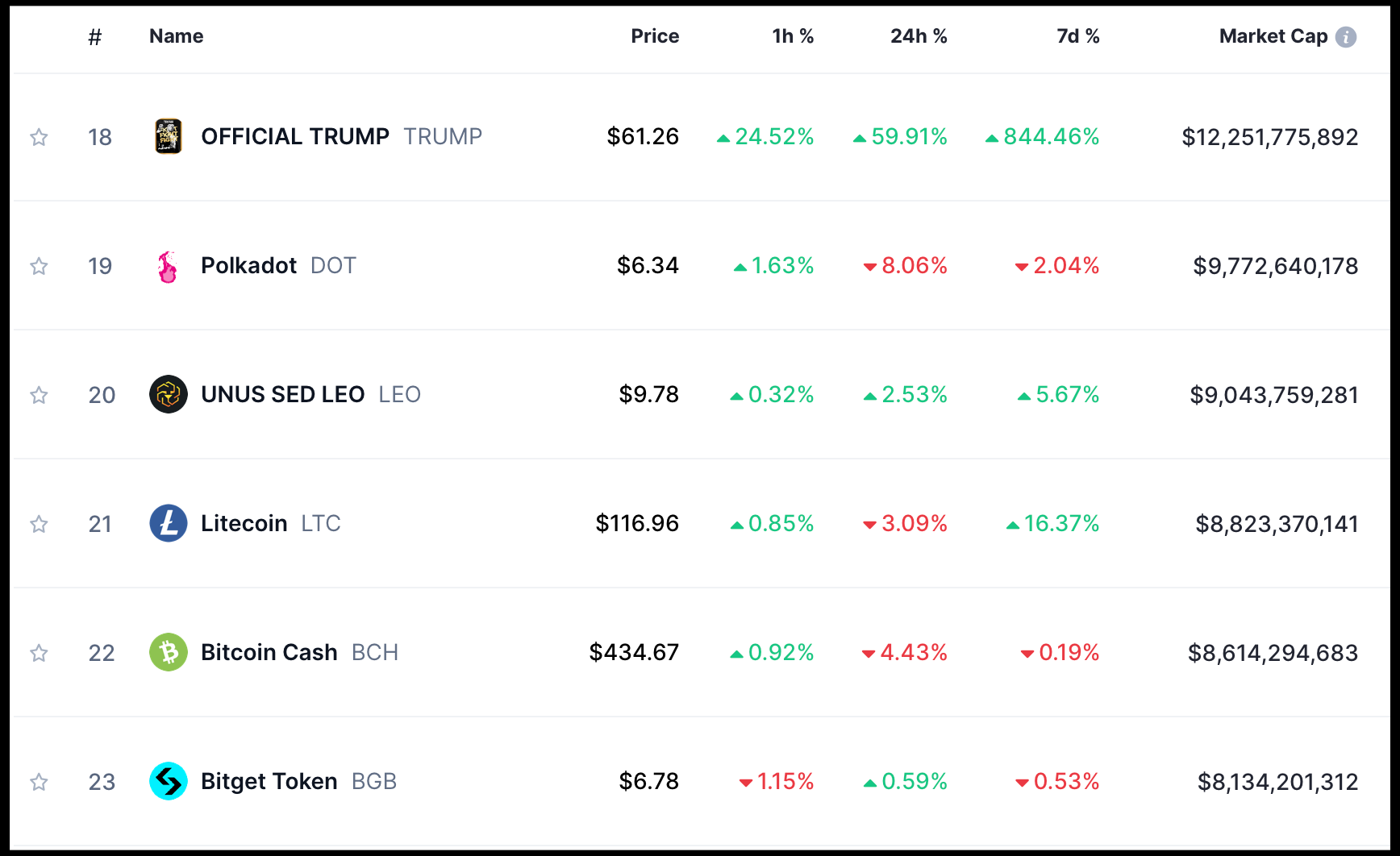 [사진 = 트럼프 밈코인 화제가 된 오피셜 트럼프 전체 시가총액 18위 기록중입니다. 그 이전에 순위가 계속 오르내리락하는 중이라 앞으로 몇 위에 있을지는 알 수 없습니다. 시가총액 원화 환산 시 17조 원입니다. 밈코인치고는 어마어마한 금액이 쌓였습니다. 앞으로의 추이가 어떻게 될지 주목됩니다. (C) 코인마켓캡 공식 홈페이지(coinmarketcap.com)]