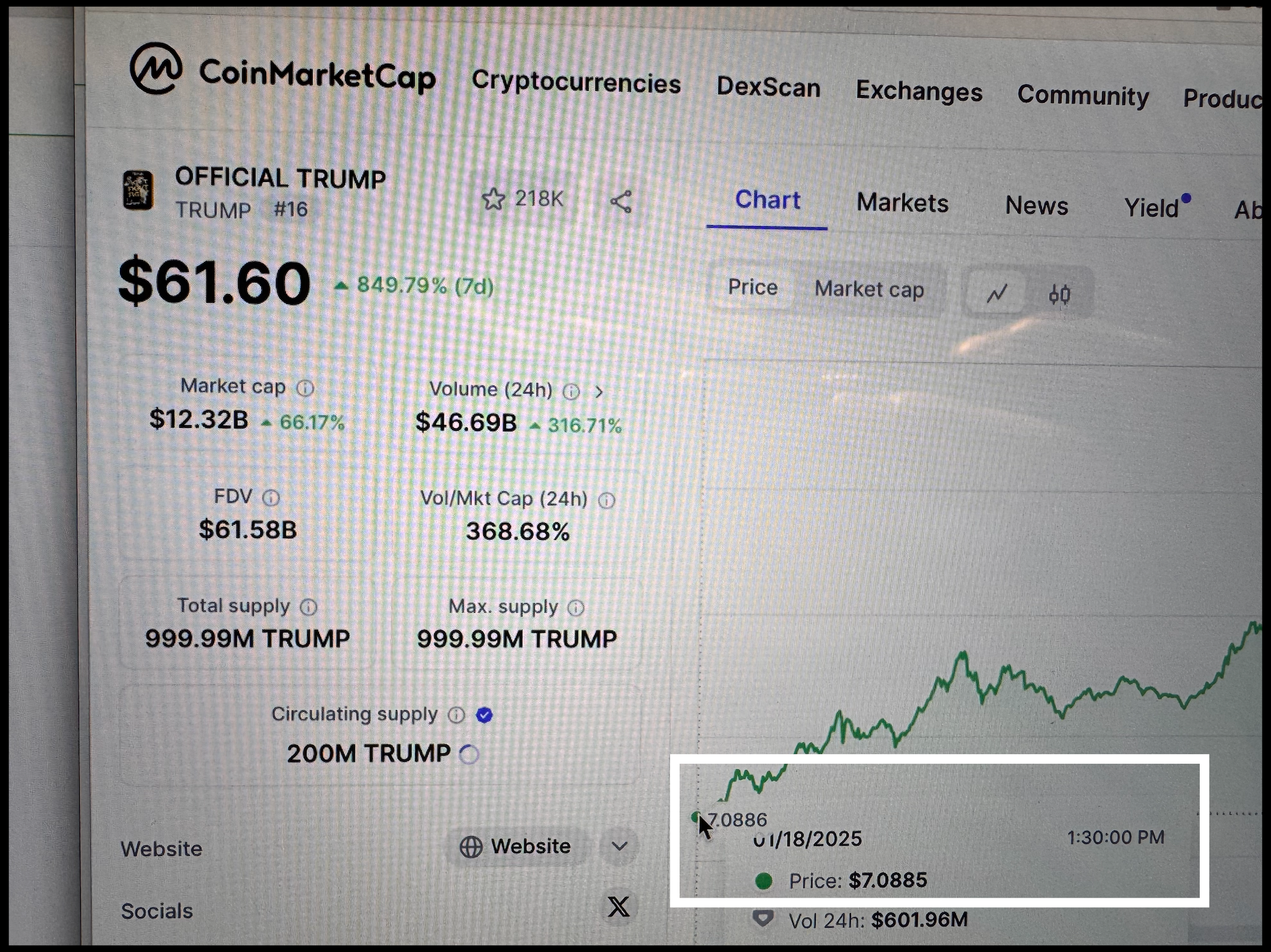 -도널드 트럼프 미국 대통령 취임 앞두고 발행된 코인, 전체 시가총액 18위 기록중(현재 기준)
