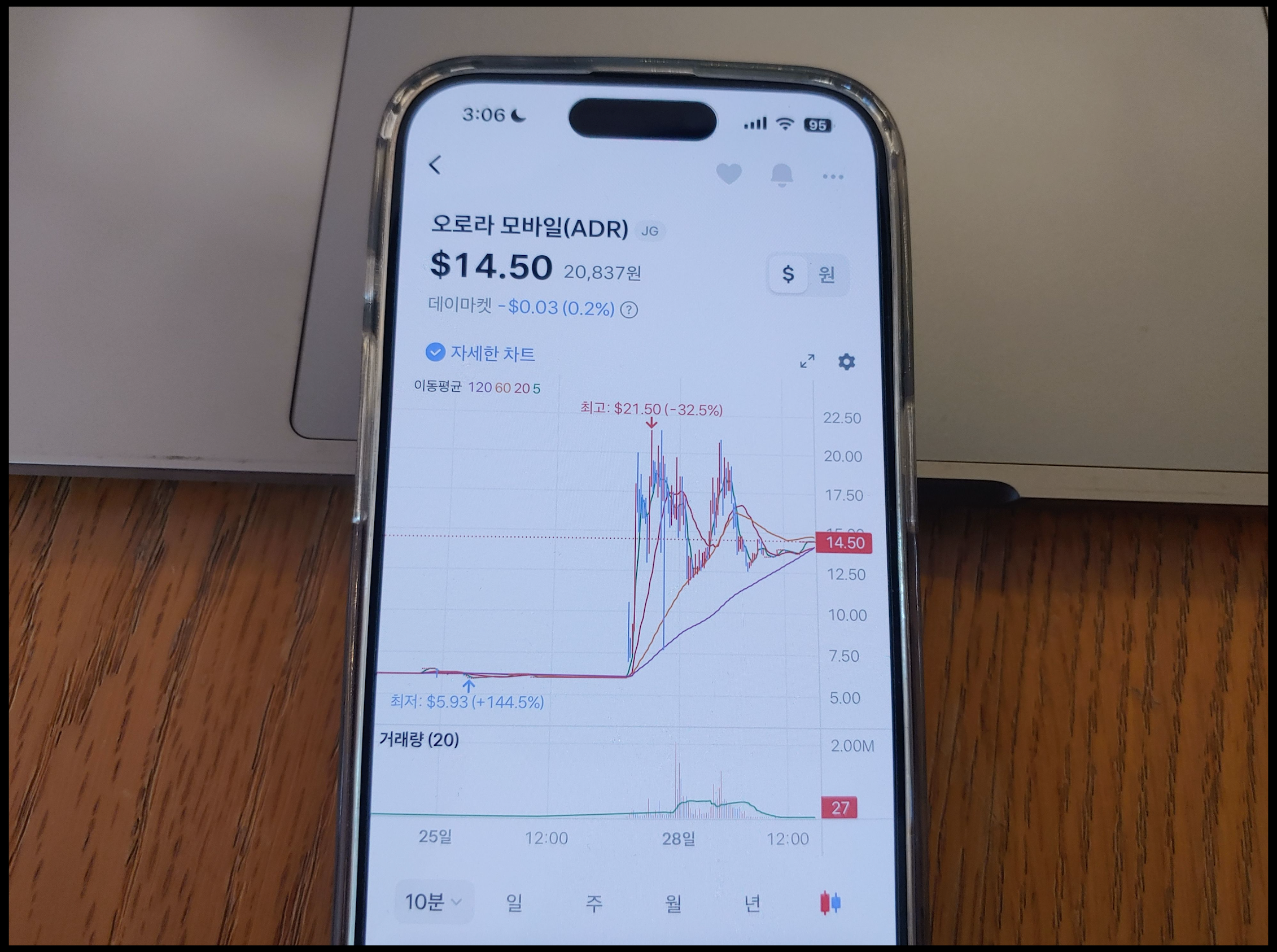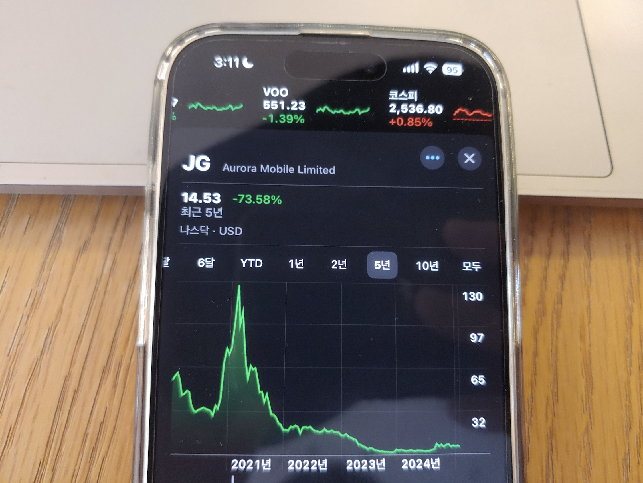[사진 = 딥시크 관련주 오로라 모바일 ADR(티커 : JG) 지난 2년 간, 5년 간 추이를 보면 과거에는 어마어마하게 올랐다가 크게 폭락했던 종목입니다. 2021년 초 130달러 수준까지 올라갔으나 불과 얼마전까지 5달러대에 있었습니다. 그 사이에 끝없는 폭락이 있었습니다. 과연 이 종목 투자가 괜찮은지 의문이 있습니다. 일단 장투 목적은 조심해야 할 것 같습니다. (C) 아이폰 주식 앱]