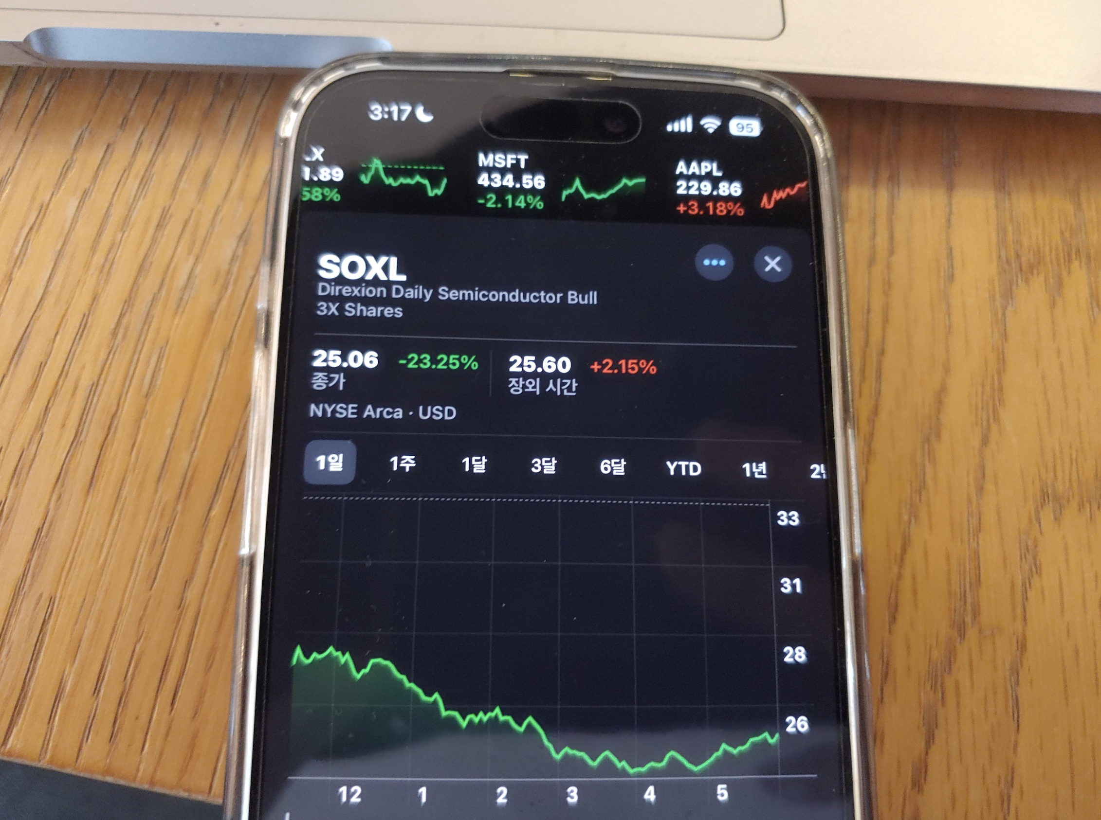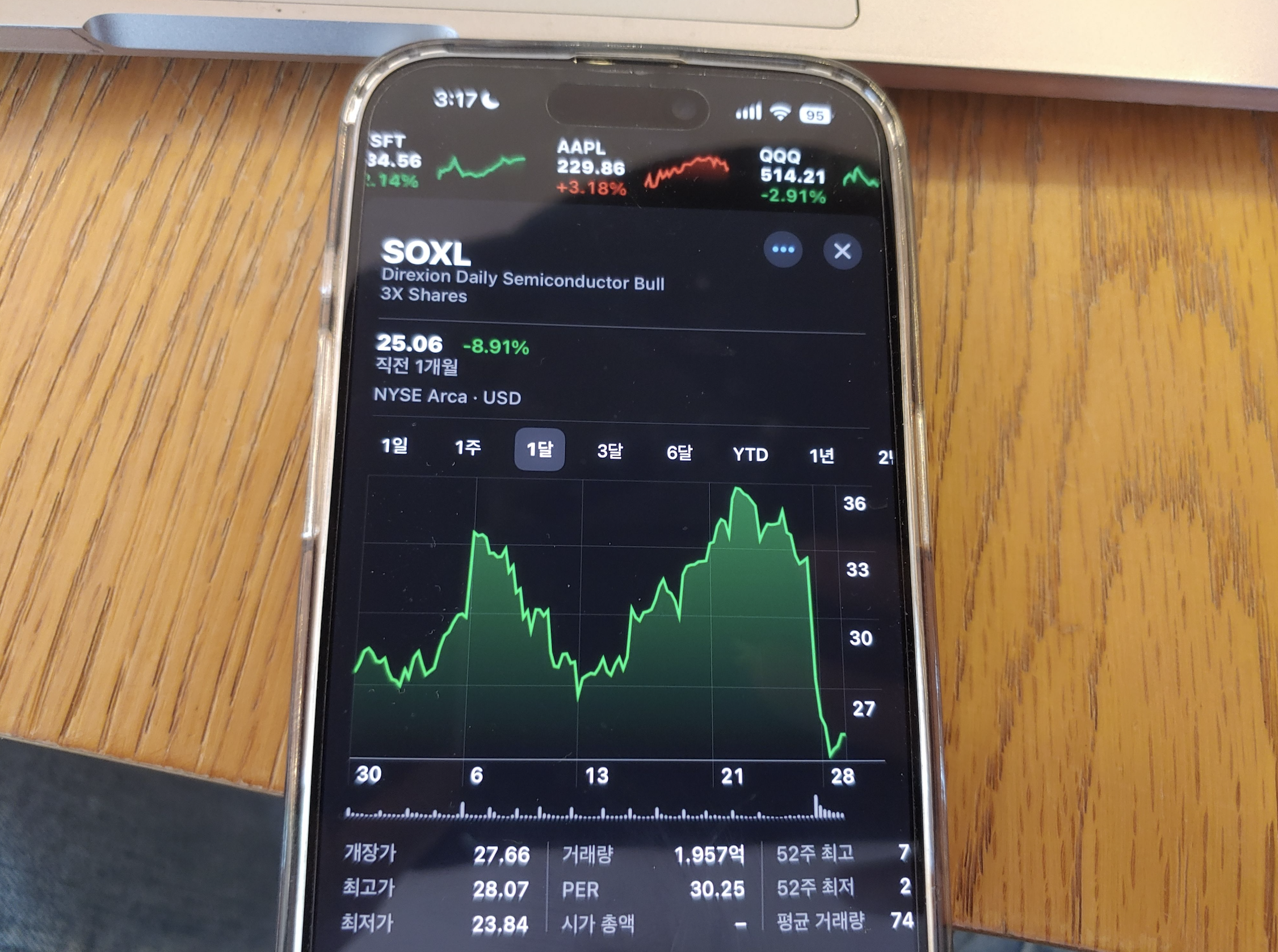 [사진 = 엔비디아 비중이 높은 SOXL ETF 1월 27일에 23.25% 하락한 25.06달러로 내려 앉았습니다. 불과 며칠 전까지 36달러 도달했는데 갑자기 내려갔습니다. 이 종목은 브로드컴 비중도 꽤 높습니다. 엎친데 덮친 격으로 브로드컴 17.40% 하락한 영향까지 받게 됐습니다. 해당 ETF는 지난 1년 동안 한국인들에게 인기 높았습니다. (C) 아이폰 주식 앱]