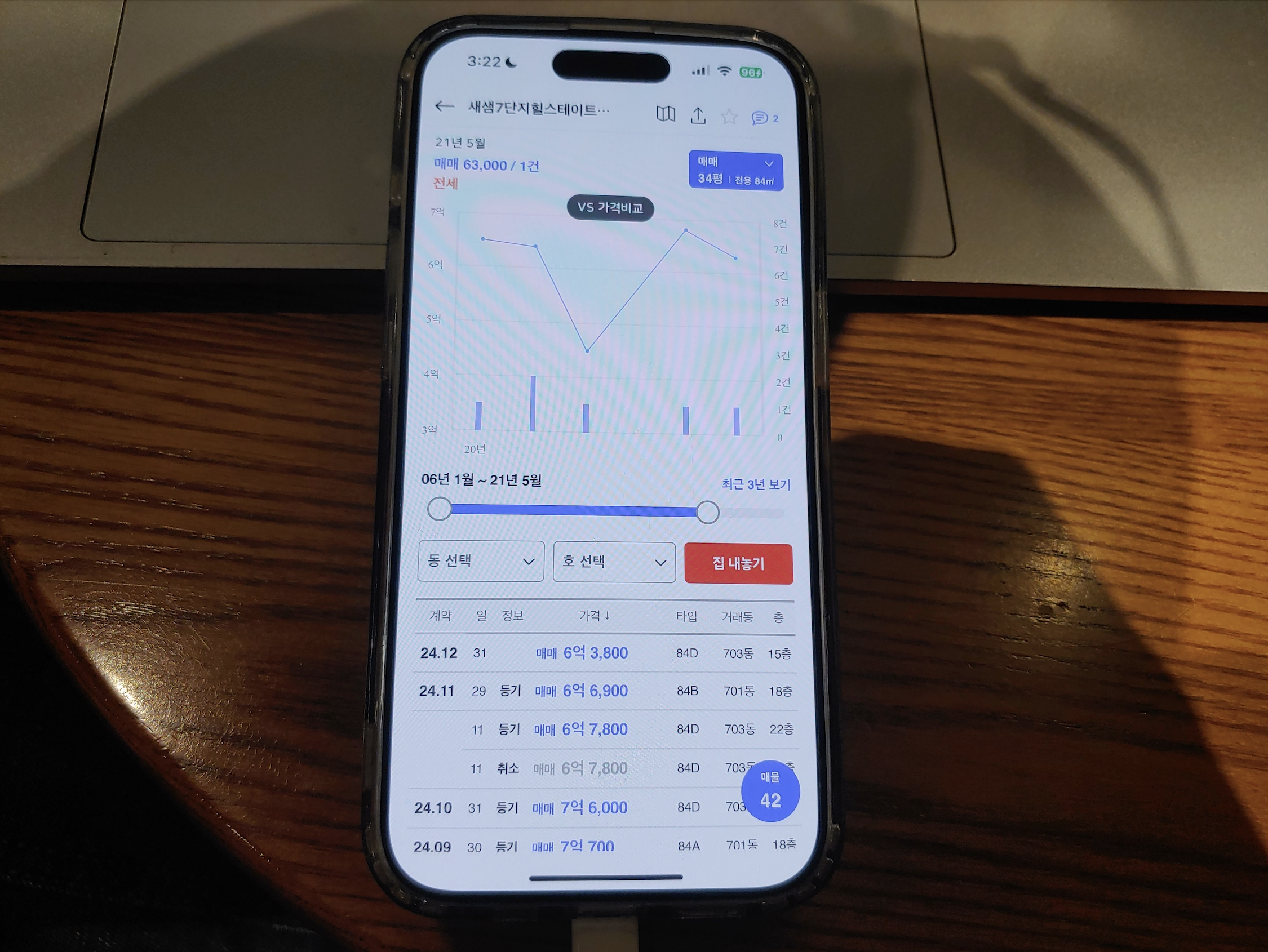 7단지 703동 84타입 최근 거래 : 6억 3,800만 원(2024년 12월) / 시세 차익 3억 원
