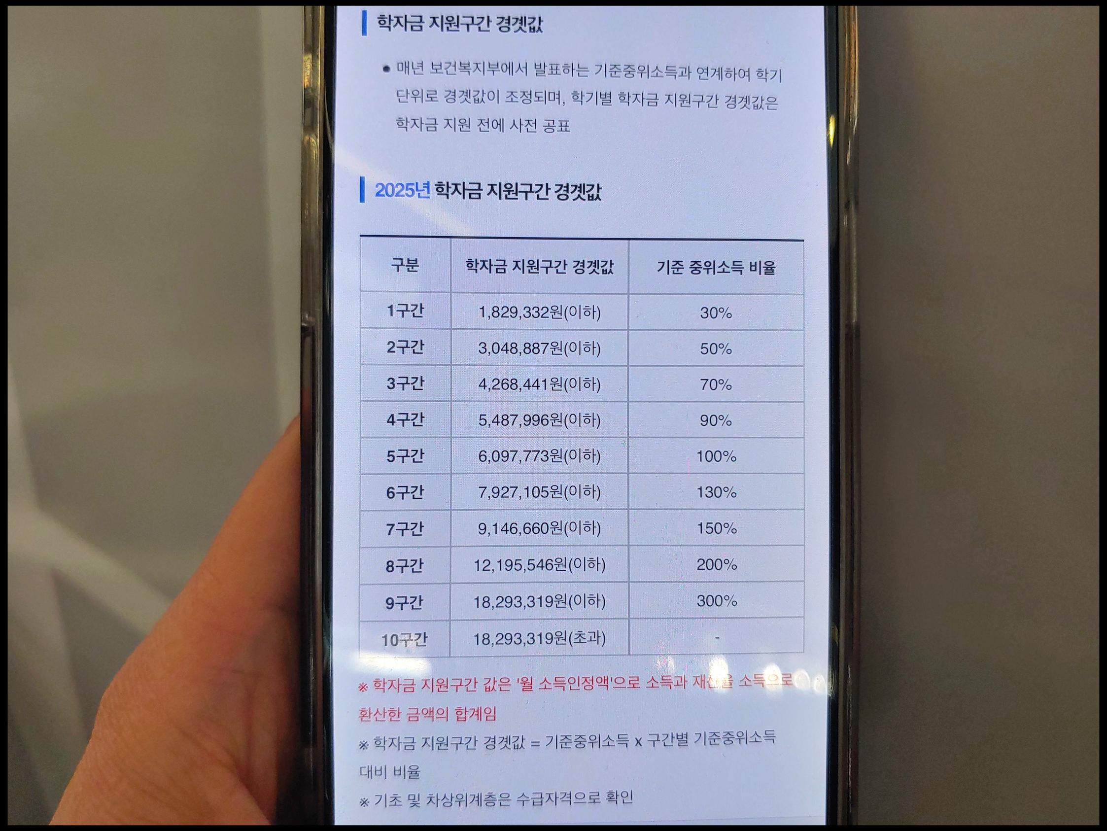 [사진 = 국가장학금 구간 확인 관련하여 2025년 학자금 지원구간 경곗값 이렇습니다. 여기서 해당 값은 '월 소득인정액' 입니다. 소득 및 재산을 소득으로 환산한 금액의 합계입니다. 소득이 낮을 수록 지원금이 더 높아집니다. 기존에는 1구간부터 8구간까지 해당 장학금 지원 받을 수 있었으나 이번에 9구간 새롭게 추가됐습니다. 지원 대상에 속하는 분이 이전보다 더 확대됐습니다. (C) 한국장학재단 공식 홈페이지(kosaf.go.kr)]
