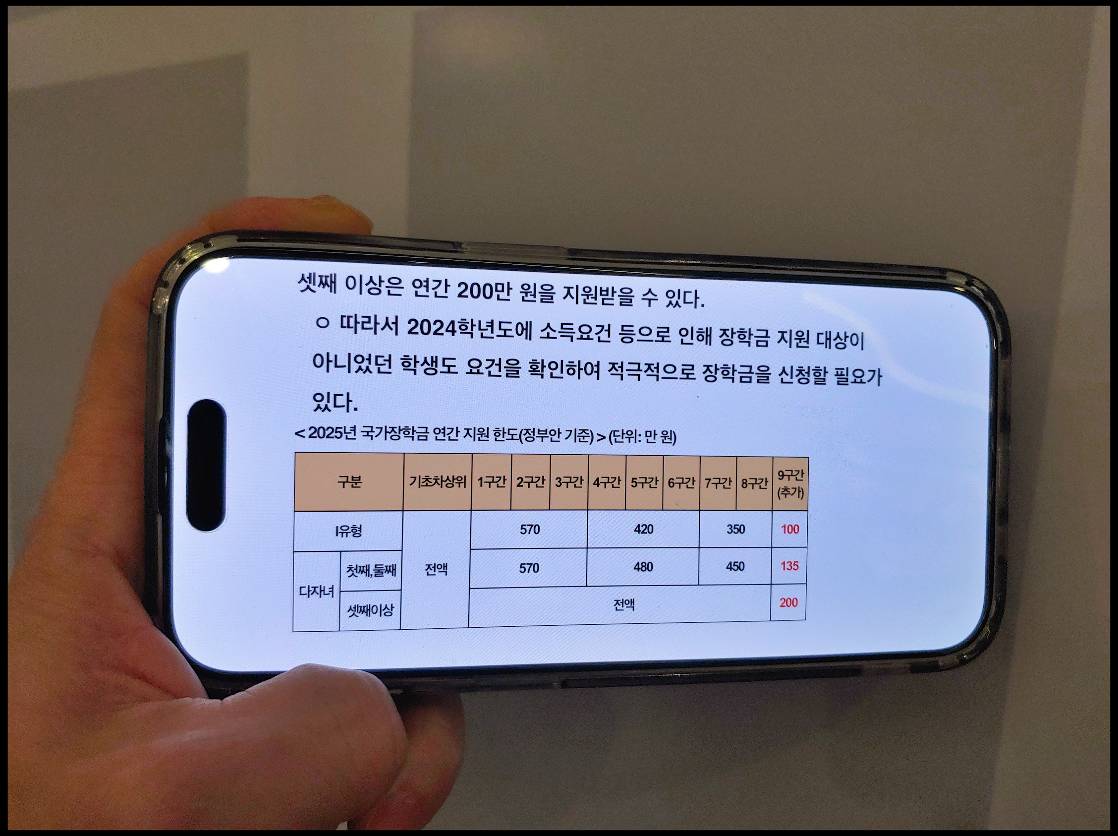 [사진 = 2025 국가장학금 I유형 및 다자녀 연간 최대 지원금액 입니다. 이번에 새롭게 추가된 9구간은 I유형 연간 100만 원, 다자녀 첫째 및 둘째는 연간 135만 원, 셋째 이상은 연간 200만 원 지원됩니다. 이전연도에 다른 요건에 의해 장학금 지원 해당되지 않았던 분들 중에도 혜택 적용되는 분이 있을 것으로 보입니다. 국가장학금 구간 확인 진행해야 할 이유가 생겼습니다. (C) 한국장학재단 공식 홈페이지(kosaf.go.kr)]