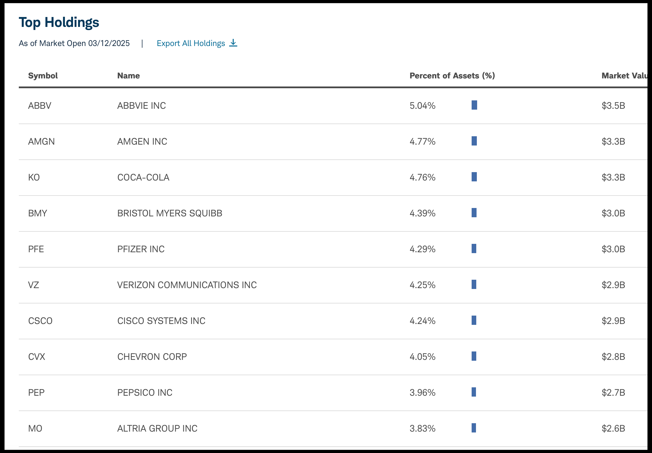 [사진 = SCHD ETF 구성종목 상위 10대 보유 종목들입니다. 애브비(ABBV, 5.04%) 암젠(AMGV, 4.77%) 코카콜라(KO, 4.76%) 브리스톨 마이어스 스퀴브(BMY, 4.39%) 화이자(PFE, 4.29%) 버라이즌(VZ, 4.25%) 시스코 시스템즈(CSCO, 4.24%) 쉐브론(CVX, 4.05%) 펩시코(PEP, 3.96%) 알트리오(MO, 3.83%) 입니다. 2025년 3월 12일 현재 기준입니다. 구성종목은 매 분기마다 리밸런싱이 진행됩니다. 3/6/9/12월 셋째주 금요일 입니다. 특히 3월에 종목 교체가 활발하다고 합니다. 지난해 3월에는 23개 종목이 빠지고 새로운 23개가 편입됐습니다. (C) schwabassetmanagement.com]