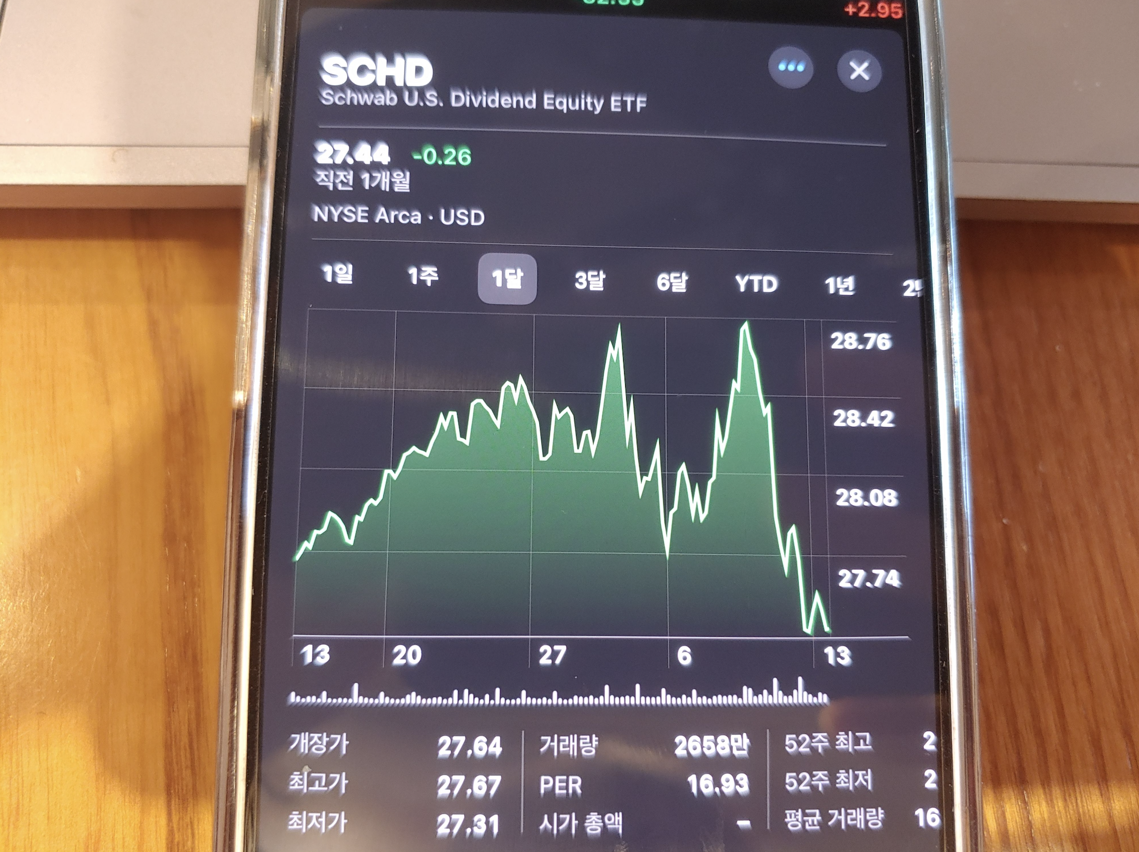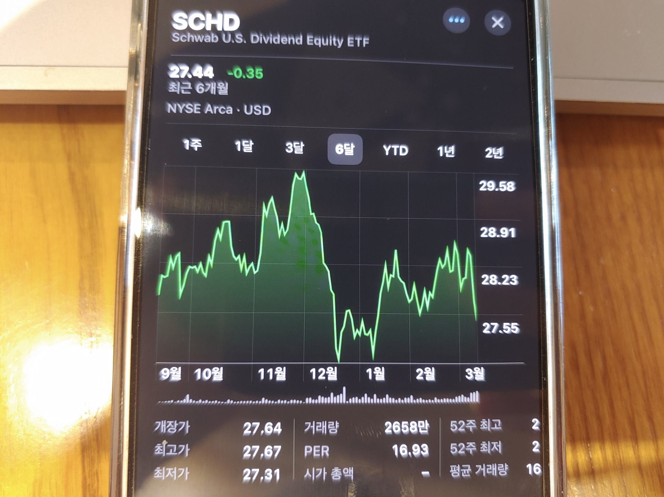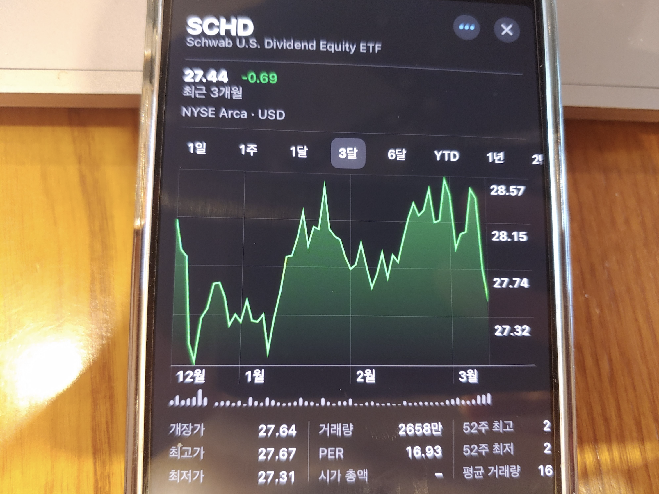 [사진 = SCHD ETF 지난 1개월, 3개월, 6개월 추이를 살펴봤습니다. 주로 27~29달러 사이에서 오가는 경향이 강합니다. 지난 11월 말에 29.72달러까지 올랐으나 12월 19일 26.93달러가지 떨어졌습니다. 그 이후 28달러까지 회복할 때가 있었으며, 트럼프 관세 이슈로 빅테크들이 폭락을 거듭했을 때에도 28달러선을 지켰습니다. 그러다가 3월 12일 빅테크들이 폭락을 멈추자 27달러대 중반으로 내려갔습니다. (C) 아이폰 주식 앱]