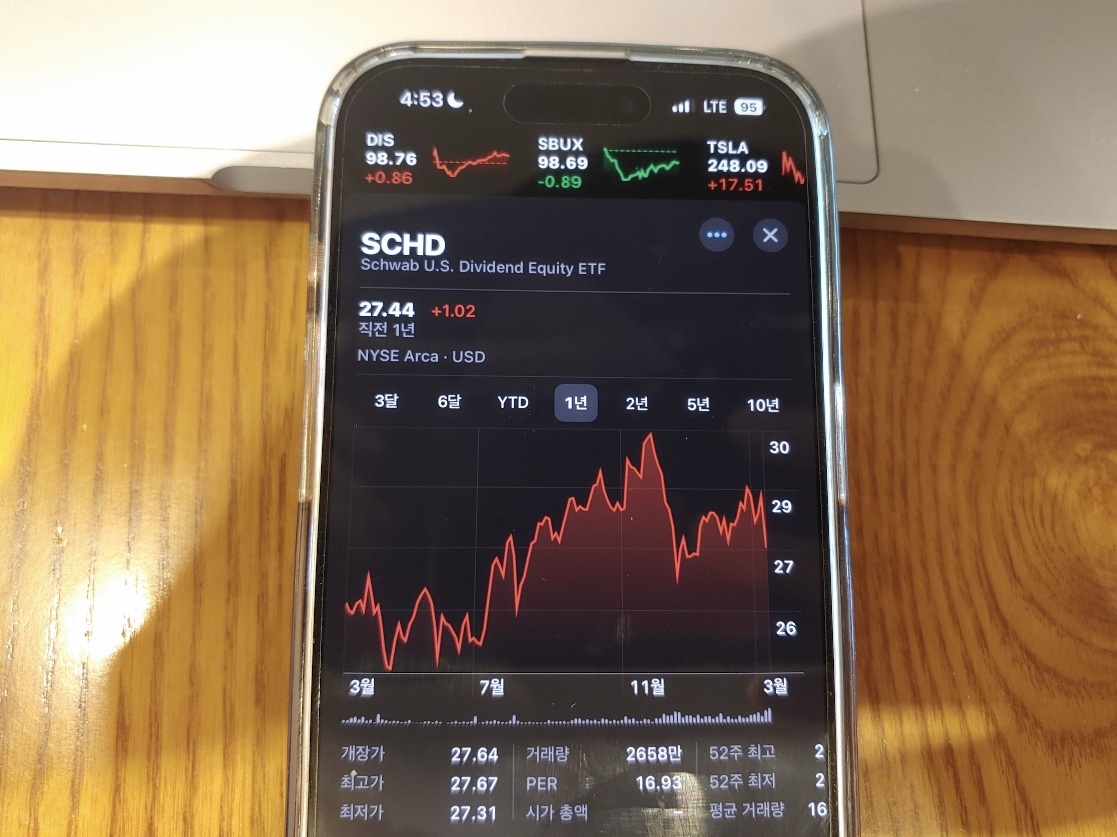 [사진 = SCHD ETF 지난 1개월, 3개월, 6개월 추이를 살펴봤습니다. 주로 27~29달러 사이에서 오가는 경향이 강합니다. 지난 11월 말에 29.72달러까지 올랐으나 12월 19일 26.93달러가지 떨어졌습니다. 그 이후 28달러까지 회복할 때가 있었으며, 트럼프 관세 이슈로 빅테크들이 폭락을 거듭했을 때에도 28달러선을 지켰습니다. 그러다가 3월 12일 빅테크들이 폭락을 멈추자 27달러대 중반으로 내려갔습니다. (C) 아이폰 주식 앱]