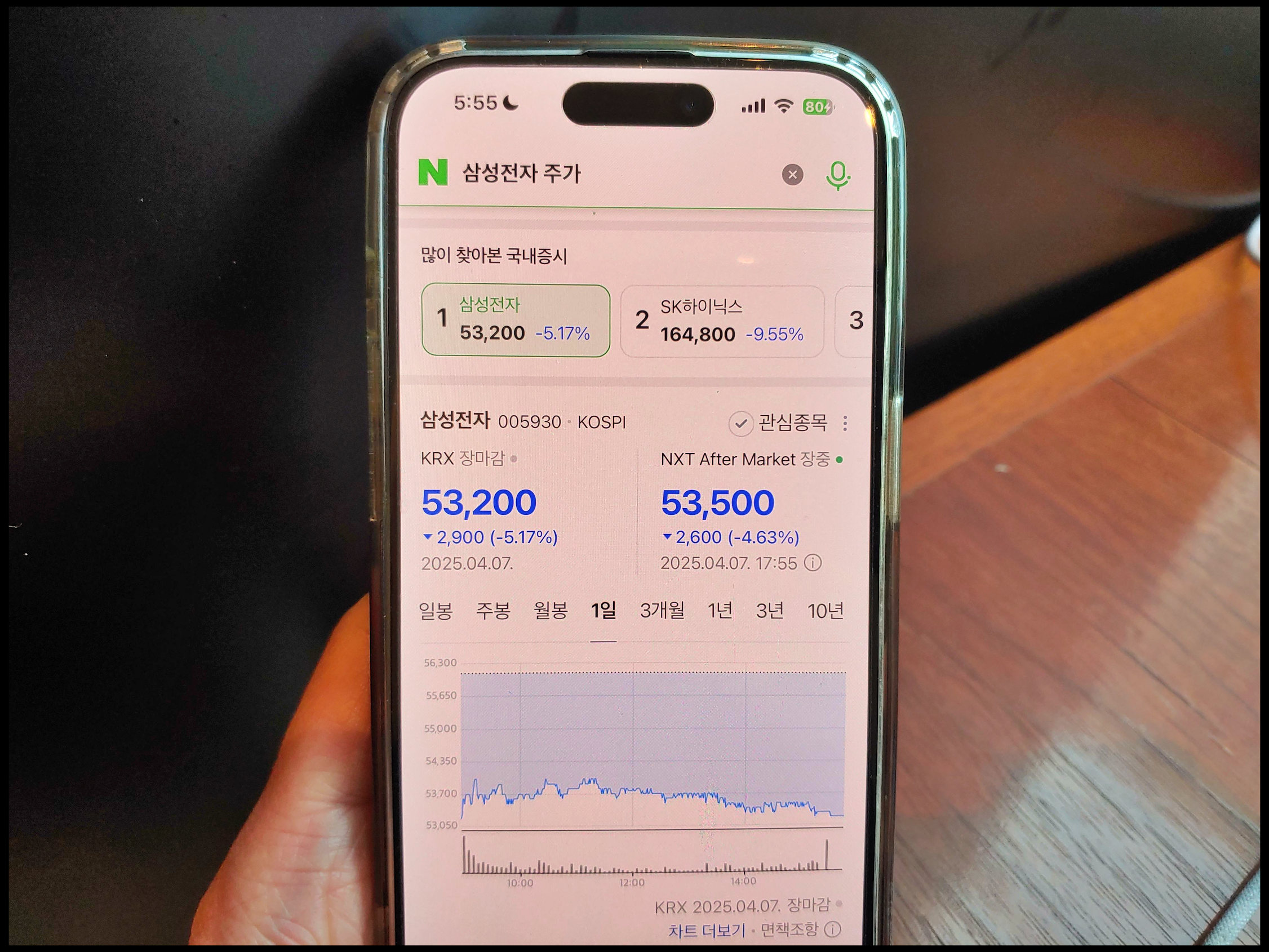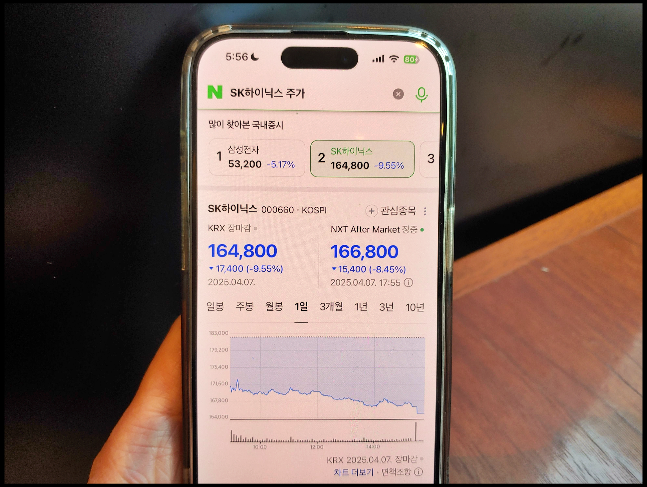 혹시나 이 종목 최근에 투자하셔서 수익을 봤던 분들이 있을 것으로 예상합니다. SOXL ETF 전망이 어렵다면 다른 성격의 종목 흐름이 밝을 가능성 높기 때문입니다. 다만, 개인적인 생각으로는 국내에서 SOXS 보다는 SOXL 투자하신 분이 더 많은 것으로 파악됩니다.(토스 인기주식 상위에 SOXL이 항상 상위권에 뜨는 중. SOXS는 어쩌다 10위권 안에 포함되는 정도?) SOXS의 상승은 미국 반도체 업황이 어려울 때 강세이며, 그 영향을 국내 반도체 종목이 받기 쉽습니다. 공교롭게도 4월 7일 국내 시가총액 1~2위 삼성전자 -5.17%(53,200원) SK하이닉스 -9.55%(164,800원) 하락했습니다. 특히 SK하이닉스는 엔비디아 관련주 종목이라 하락 폭이 큽니다. 불과 얼마전 20만 원 넘었는데 어느 사이에 16만 원대로 내려 앉았습니다.