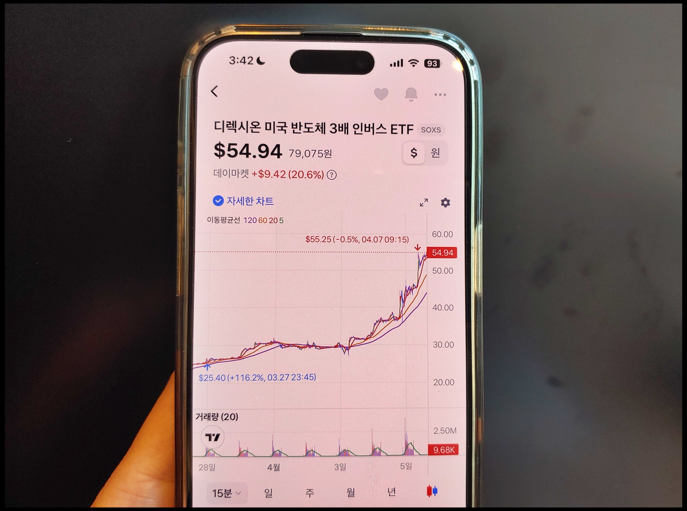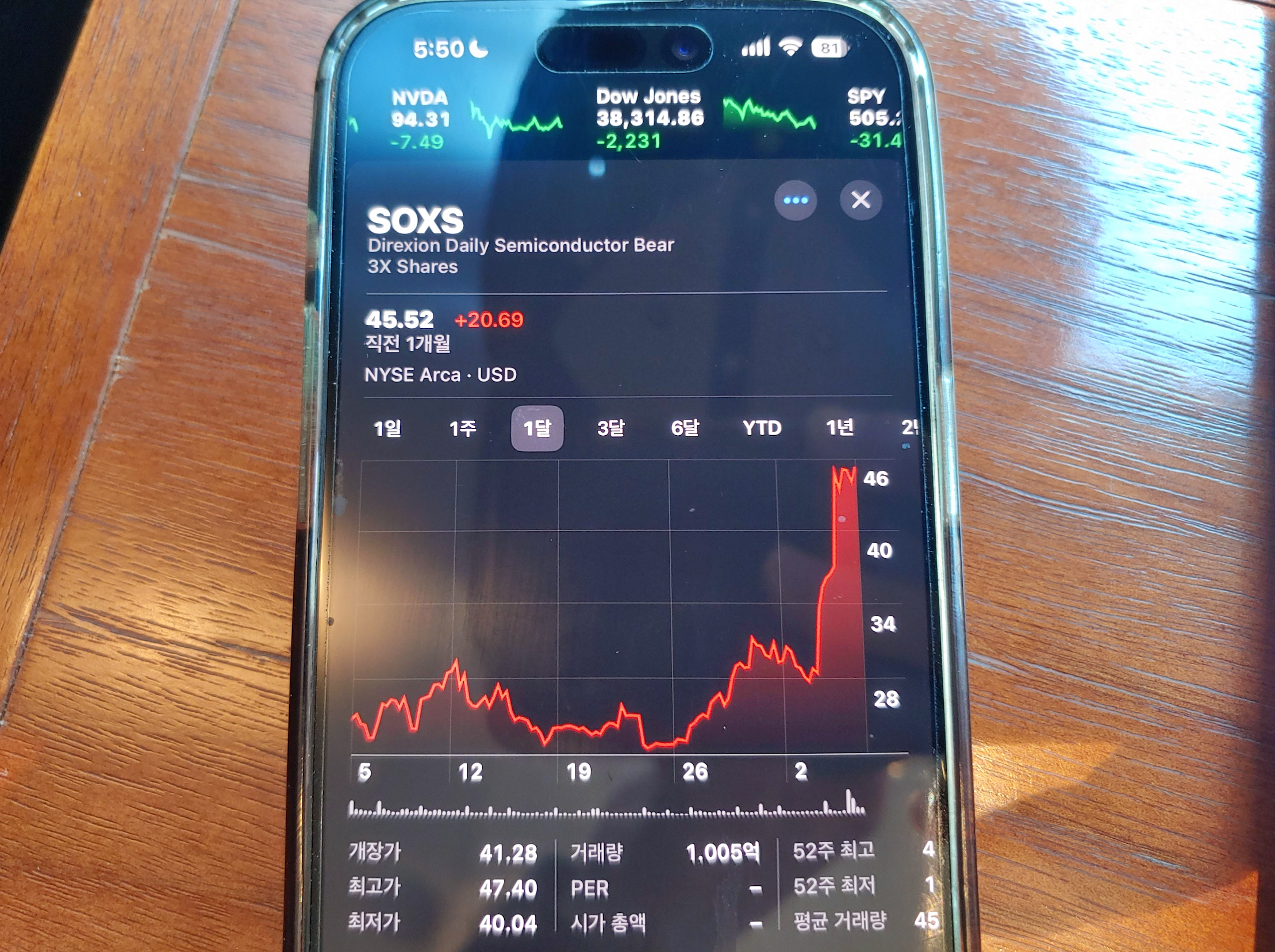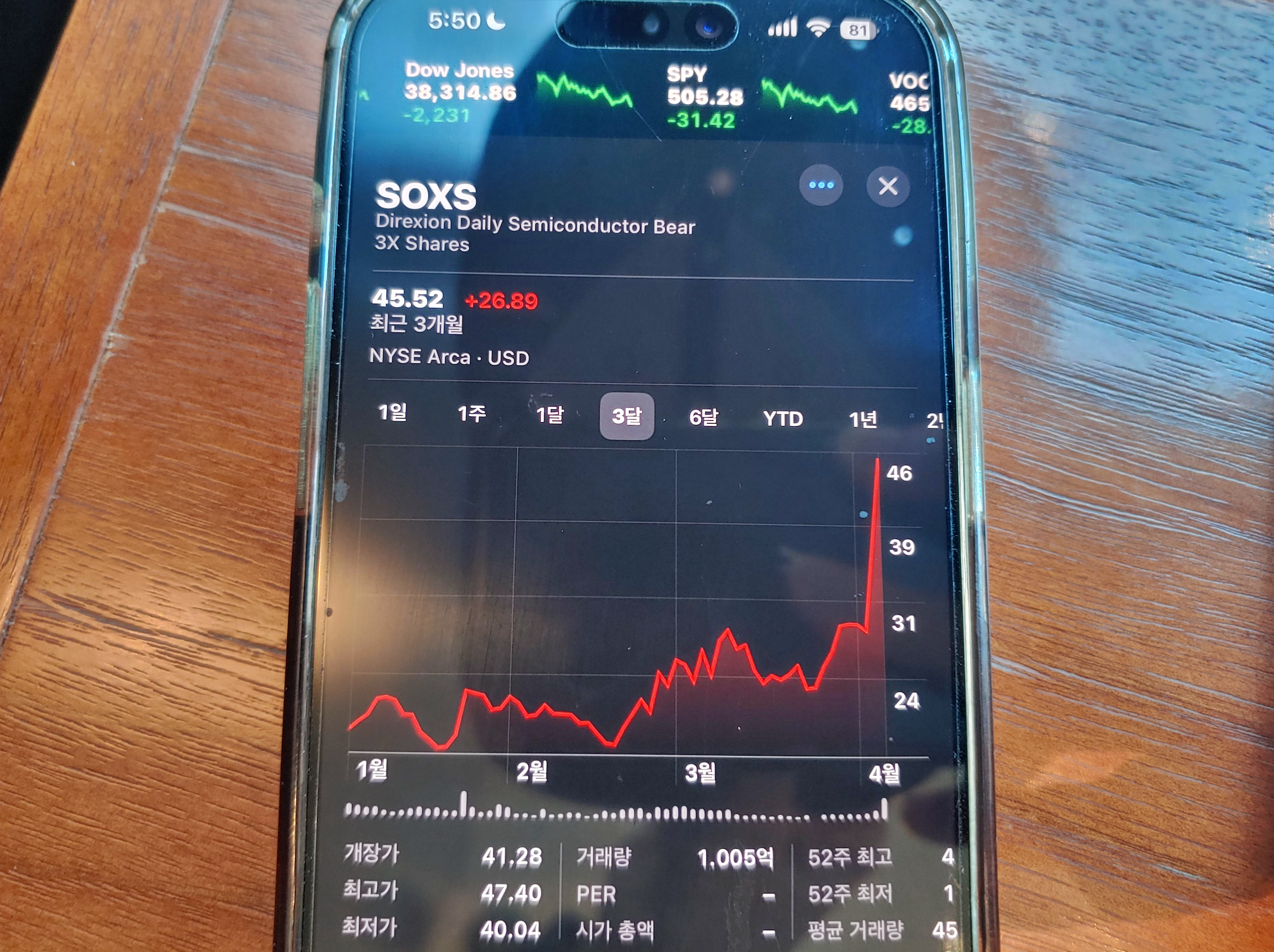 [사진 = SOXS 주가 최근 1개월, 3개월 모두 최고점 찍었습니다. 4월 3일에 이어 4일에 크게 올랐습니다. 미국 관세 수혜주 종목임을 알 수 있습니다. 웬만한 반도체 주요 종목 및 빅테크들은 같은 기간 폭락했습니다. 국내 증시 포함한 다수의 나라들 증시도 마찬가지입니다. 이 종목 오르는 흐름에 대한 사람들의 관점은 서로 다를 수 있지만, 증시가 계속 올라주기를 바라는 사람 입장에서는 반가운 존재가 아닐 수도 있습니다. (C) 아이폰 주식 앱]