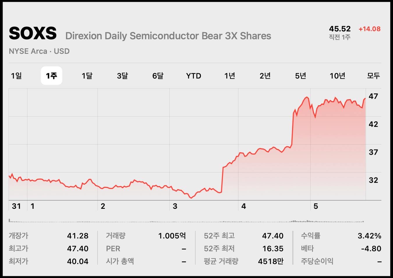 SOXS 주가 최근 1주일 동안의 흐름입니다. 같은 기간의 SOXL과 철저하게 다릅니다. SOXL 하락 이유 주요 구성종목인 엔비디아, 브로드컴 등의 폭락이 컸습니다. 현지 시간 기준 4월 4일 8.73달러로 주저 앉으며 2022년 10월 이후 10달러 미만으로 내려갔습니다. 이 종목과 반대되는 성격의 SOXS 지난 1주일 사이에 14.08달러 오른 45.52달러 기록했습니다. 미국 관세 수혜주 종목으로 봐도 될 듯합니다. 트럼프 대통령의 상호관세 발표 이후 '빅테크 중심으로' 웬만한 미국주식 주요 종목의 내림세가 두드러졌습니다. 엔비디아, 브로드컴 같은 반도체 종목들도 걷잡을 수 없이 하락했습니다. 오히려 이와 반대되는 성격의 해당 ETF가 3배 올랐습니다. 이렇게 반도체 섹터 하락일 때 수익이 나도록 설계됐습니다. 반대로 해당 섹터가 오를 때는 손실을 볼 수 있는 종목이며, 반대 성격의 SOXL 수익률 강세가 됩니다.
